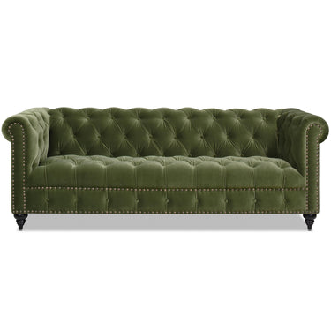 Look no further than the classically bold style of the Alto Chesterfield Sofa by Jennifer Taylor Home for your seating needs. The all-over button tufting is created with hand-covered buttons in matching upholstery and pulled deep for a truly heirloom look. The bronzed nailhead accents are individually set by master craftsmen and lend a subtly glamorous accent to the stately silhouette. This 3-seater couch is perfectly sized for entertaining and lounging, with generous rolled shelter arms and medium-deep tufted seats that make comfort second nature. Its timeless look can anchor any look in your home from transitional to modern glam.