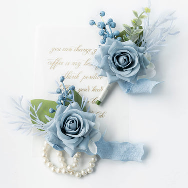 YSOJMAN Wrist Corsage Wristlet and Boutonniere Set for Wedding Bridesmaid Mother Grandmother for Bridal Shower Wedding Artificial Roses Flower Prom Set of 2 (Dusty Blue)
