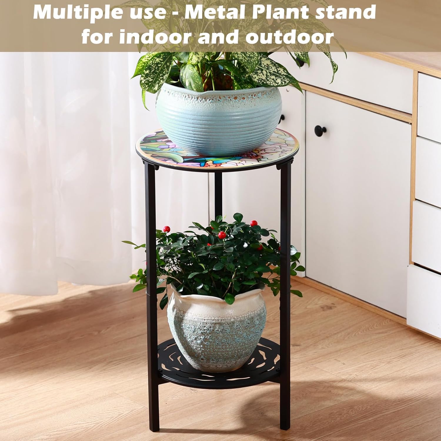 2-Tier Metal Round Side Table Black Accent Coffee Tables Small Space Corner Plant Stand Shelf for Indoor Outdoor Use Patio Balcony End Table Butterfly Print Weather-Resistant