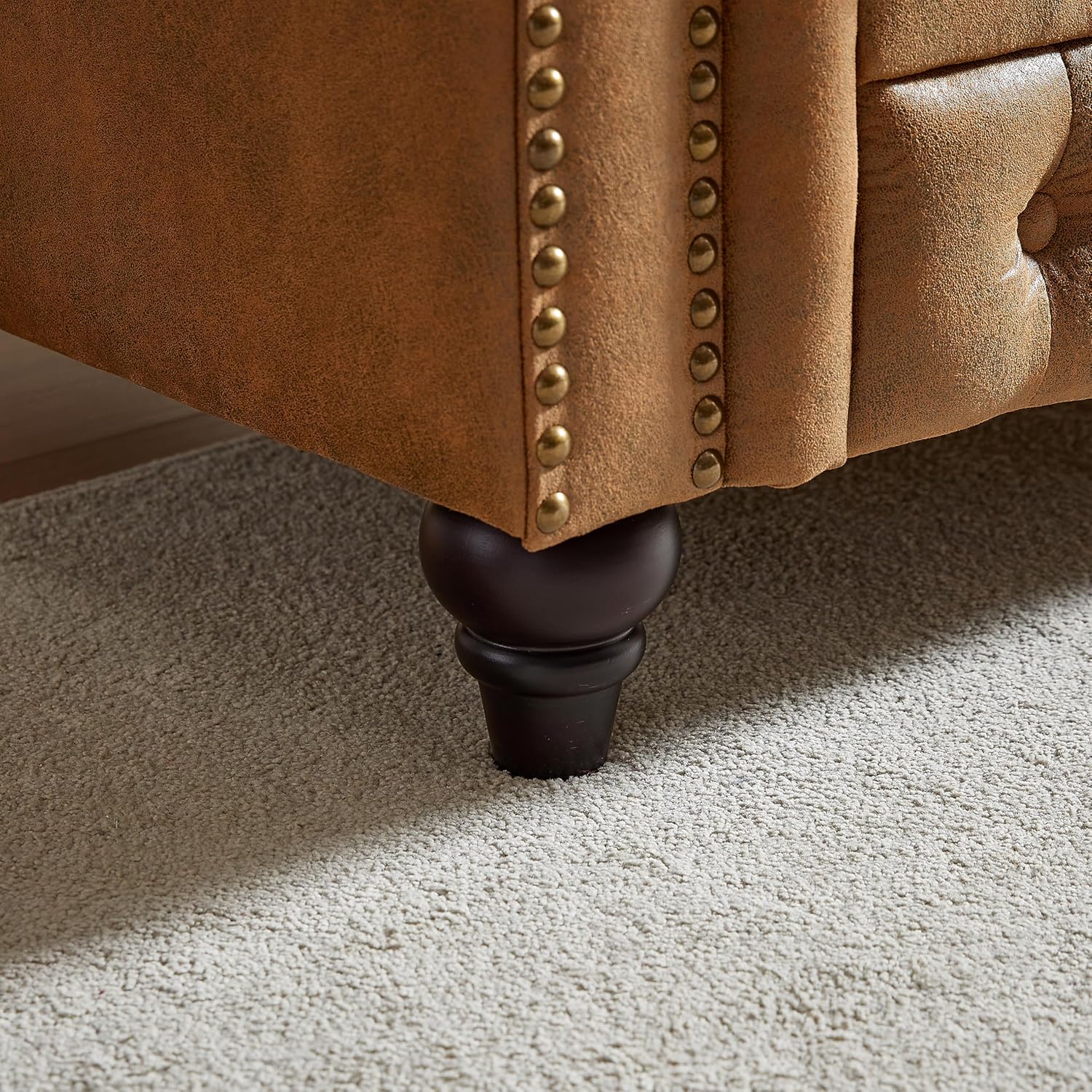 - Classic Chesterfield Style : This luxurious sofa features the styling of a modern sofa with hand-tufted buttons, rolled arms, spacious three-person seating and brown wood legs in a classic Chesterfield design. This sofa has a timeless, sophisticated vintage flair that mirrors the décor of the living room, and living room.