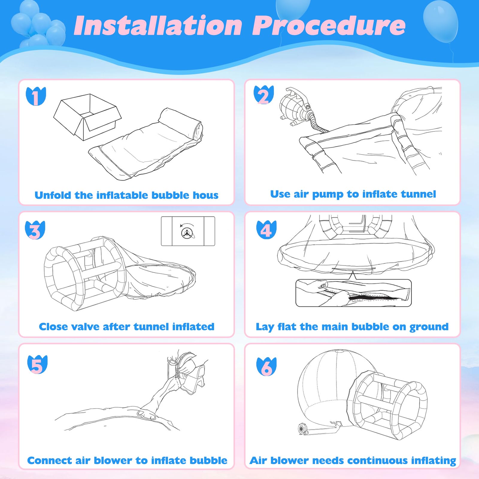 - 🎆【EFFORTLESS INFLATION AND DEFLATION】Equipped with a 650W air blower and a 550W electric air pump, our inflatable clear bubble tent is easy to set up and take down. No complex assembly required - simply use the large blower for continuous inflation of the bubble house, and the small air pump for inflation of the white pillars, completing the process in just 5 minutes.