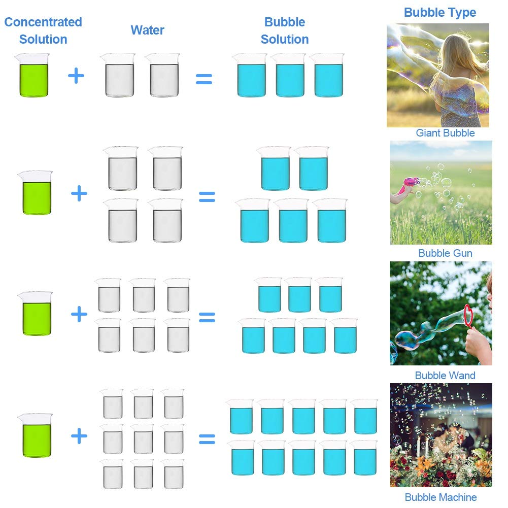 - 🌈 To Get Different Bubbles: 1L Lulu Home bubble concentrated solution can be diluted to 2.5 Gallon. ifferent proportion will get you different bubbles. For example, 1 cups of Water + 2 cups of concentrated solution = bubble solution for Giant Bubbles(for more proportion, please refer to the picture or the product description below).