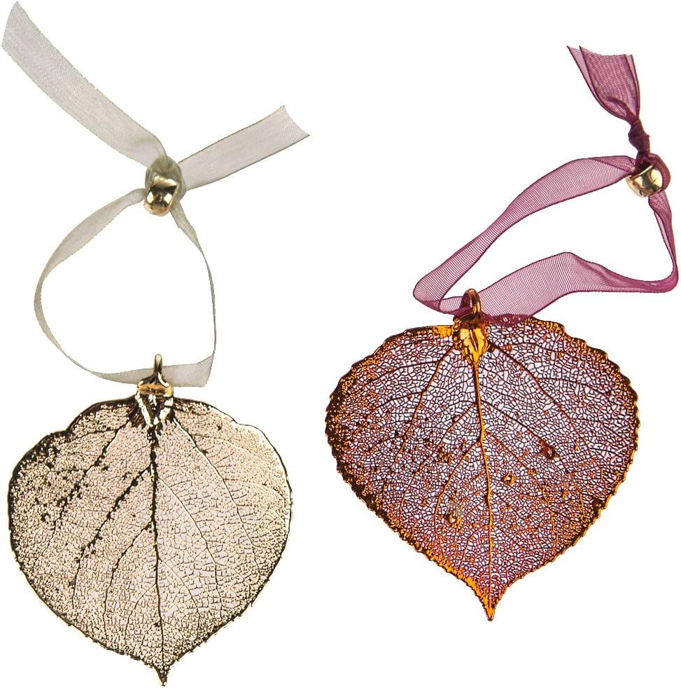 Aspen Leaf Ornaments, Set of 2 - One Copper Dipped, One Gold Dipped, Real Leaves, 2.5 Inch Length, Adjustable Ribbon Ties
