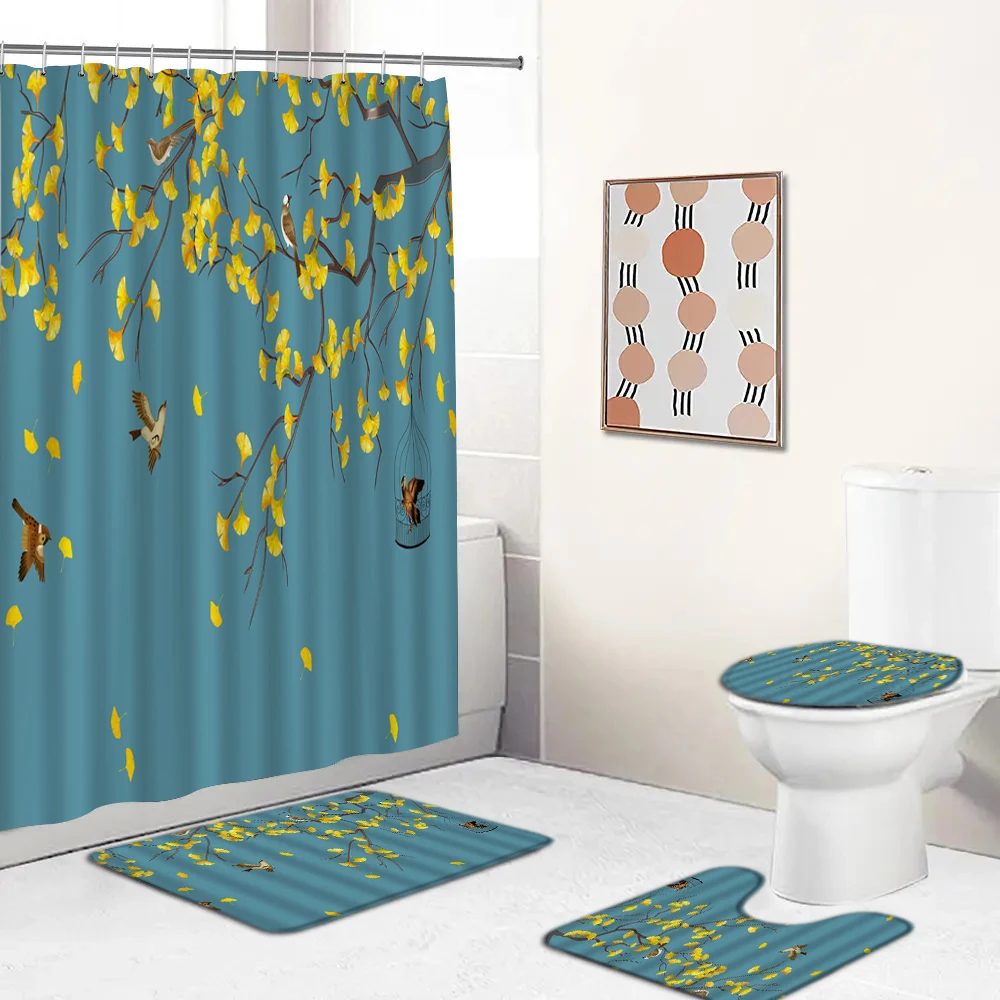 Chinese style Flowers and Birds Waterproof Shower Curtain Set Toilet Seat Cover Bath Non-Slip Mat Rug Carpet Bathroom Decor