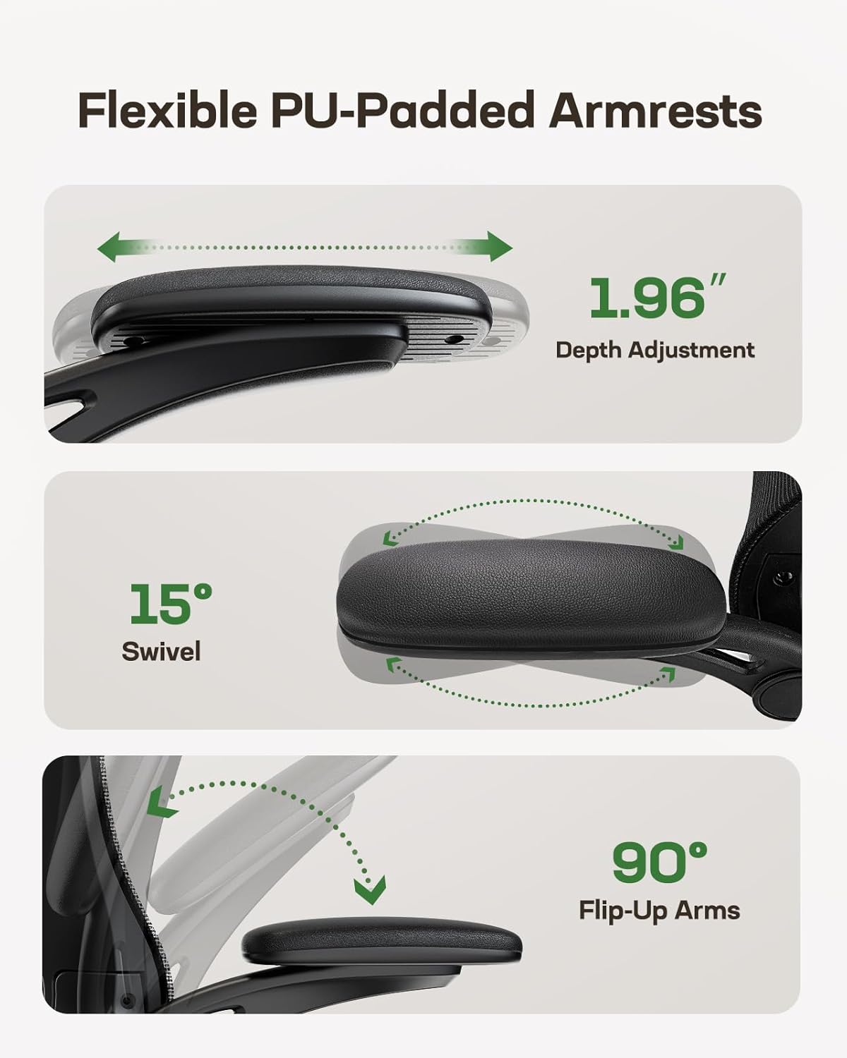 - Flexible Armrests: Move smoothly rounded PU-padded armrests forward or back and swivel them left or right to find the optimal arm position. Flip the armrests up when you want more freedom or to easily slide the ergonomic chair under the desk.