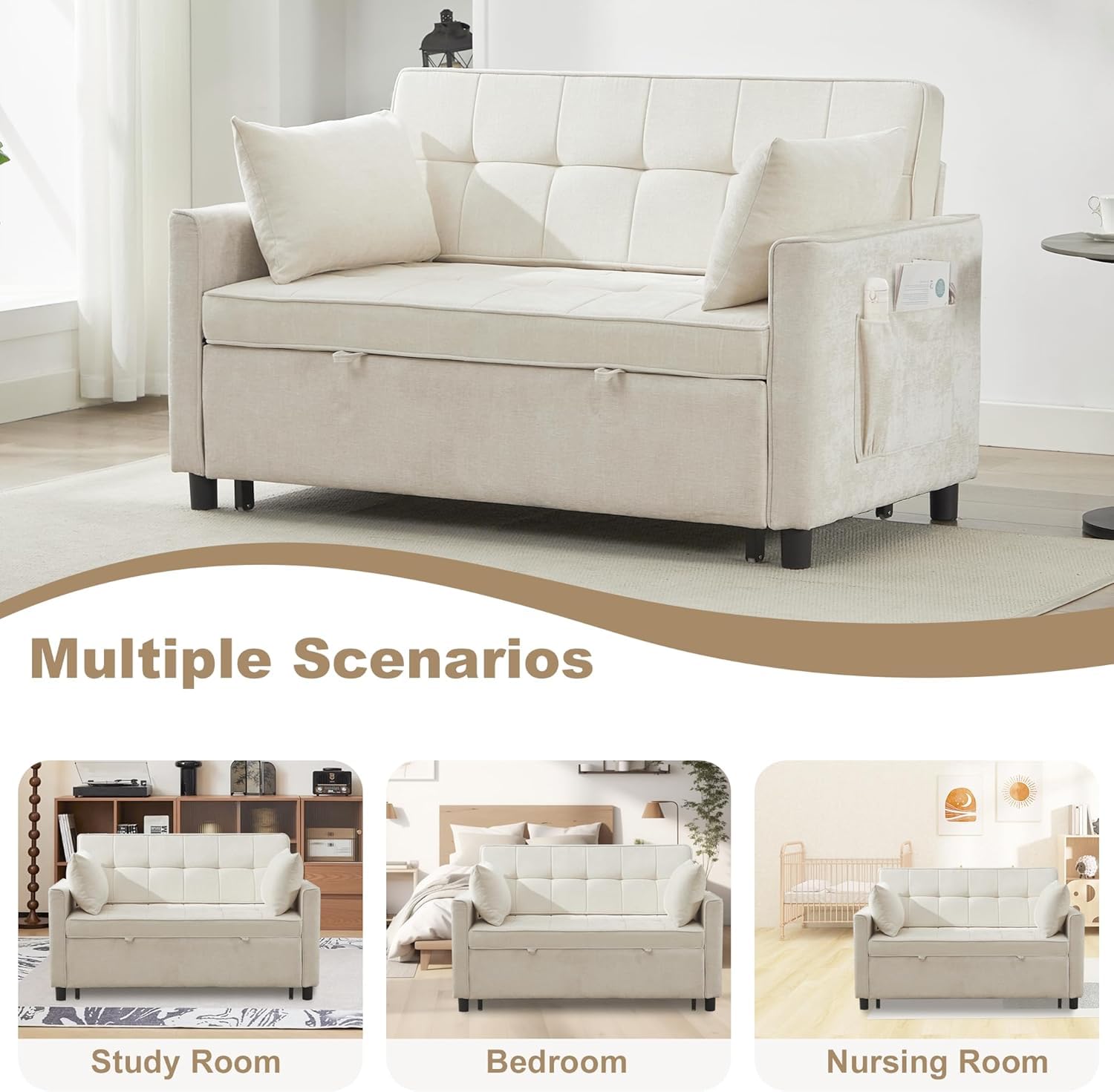 • 3-IN-1 CONVERTIBLE SOFA BED: This small versatile sofa bed can be used as a loveseat sofa, pull out sofa bed and queen size sleeper sofa. It's easy to convert between loveseat and bed with a swift and effortless pull-out mechanism. Ideal for living rooms, and small spaces such as compact apartments, dormitories, studios, offices, home theaters and rv.