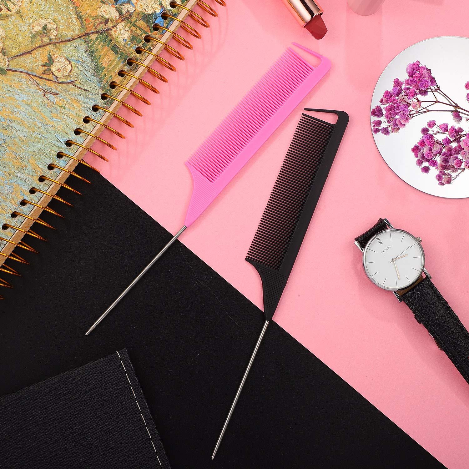 18 Pieces Parting Comb for Braids, Rat Tail Teasing Stainless Steel Pintail Comb for Hair Cutting Hair Styling Hairdressing (Black, Pink)