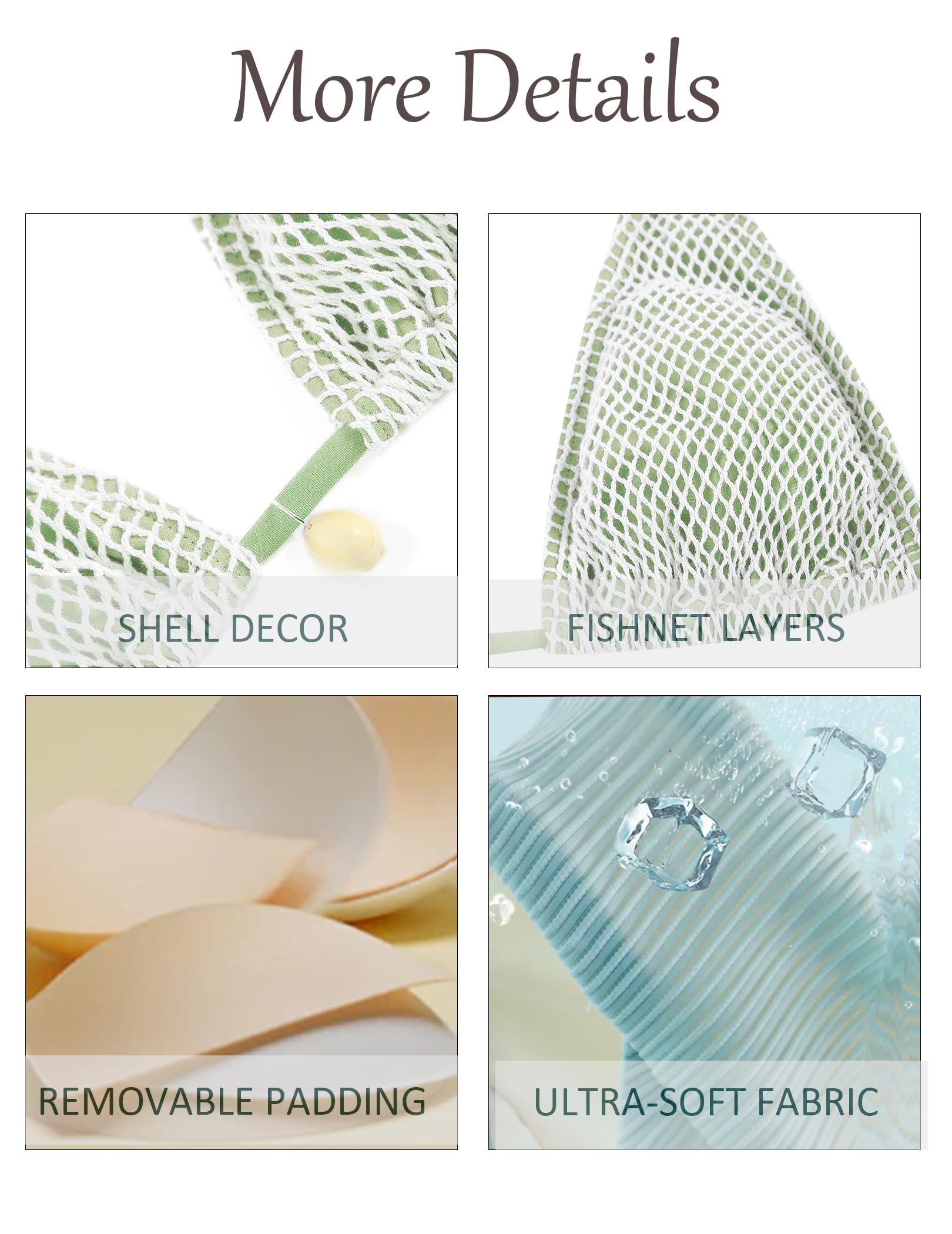 - 【SPECIAL DESIGNS】: The two piece bathing suits for women have a fishnet texture, shell decoration, removable paddings, self-tie back, adjustable spaghetti straps, open back, triangle tie side thong, and solid colors, making the bikini swimsuit perfect for summer beach.
