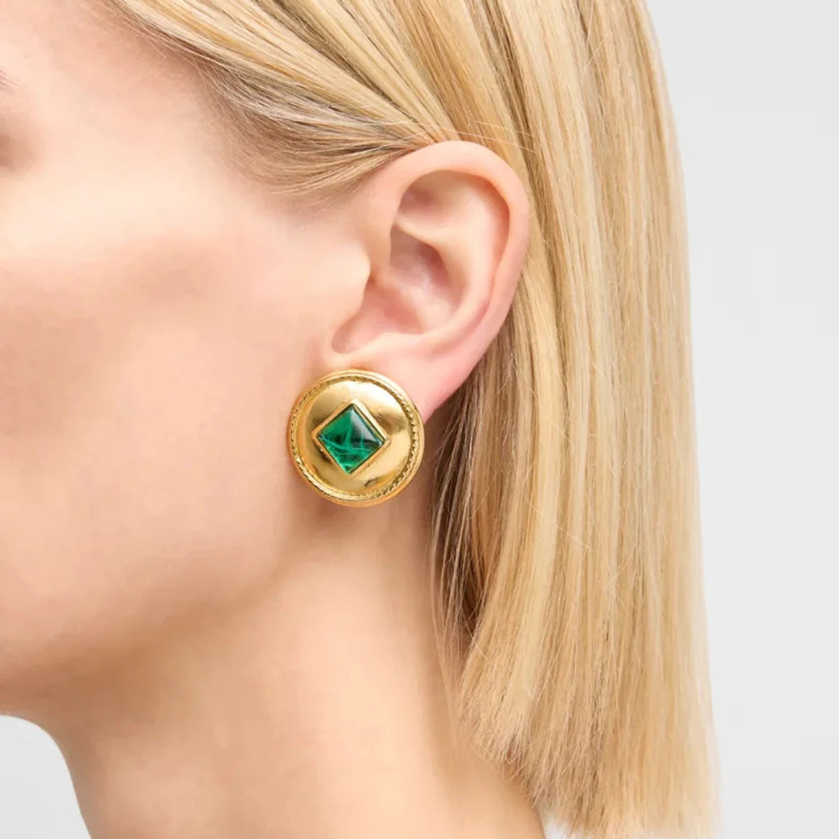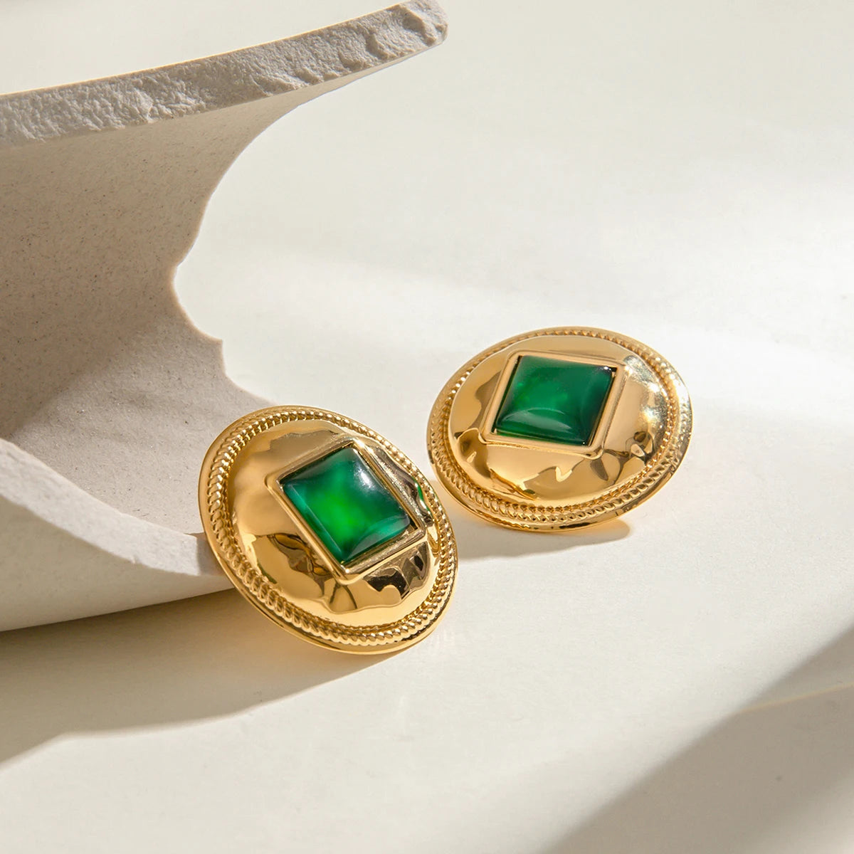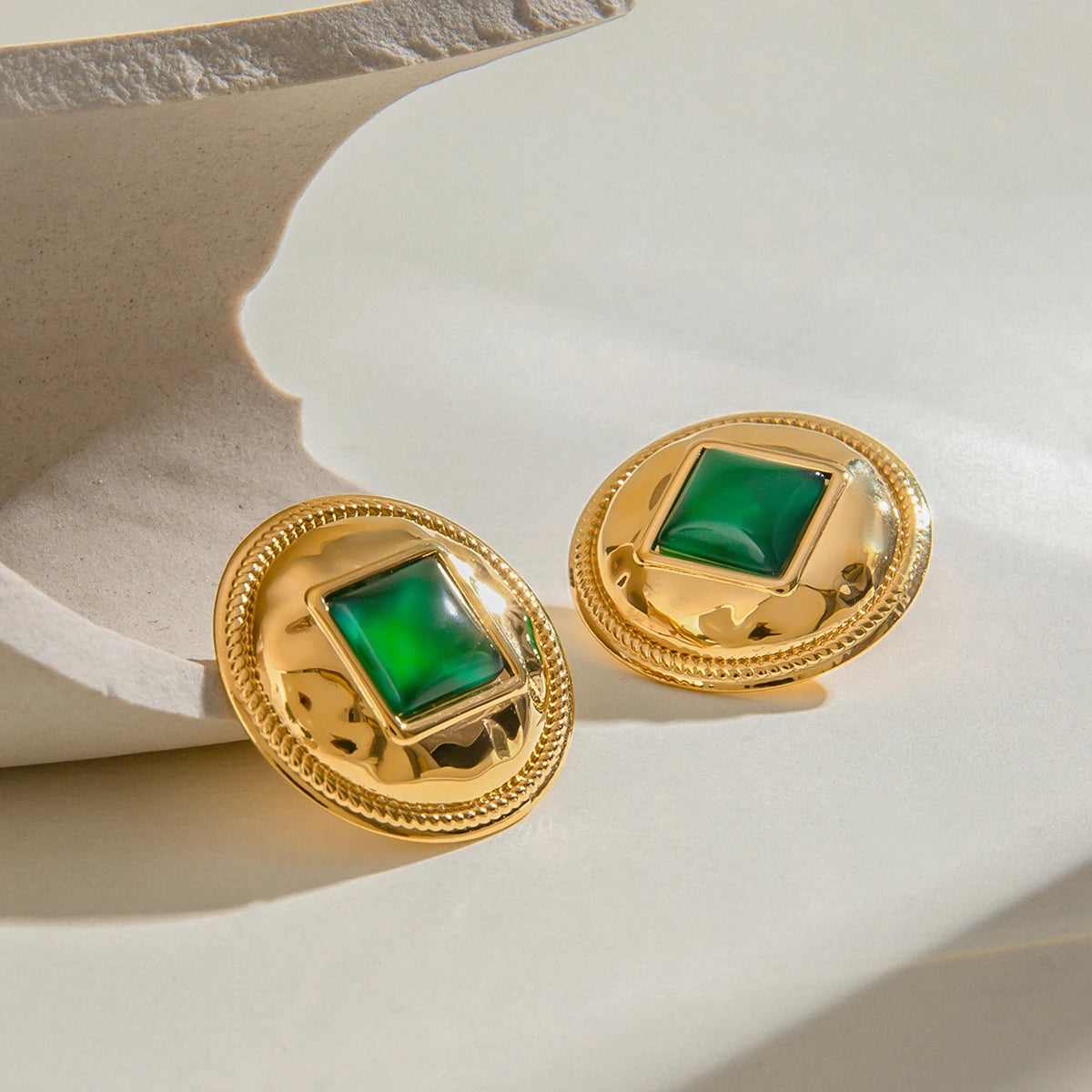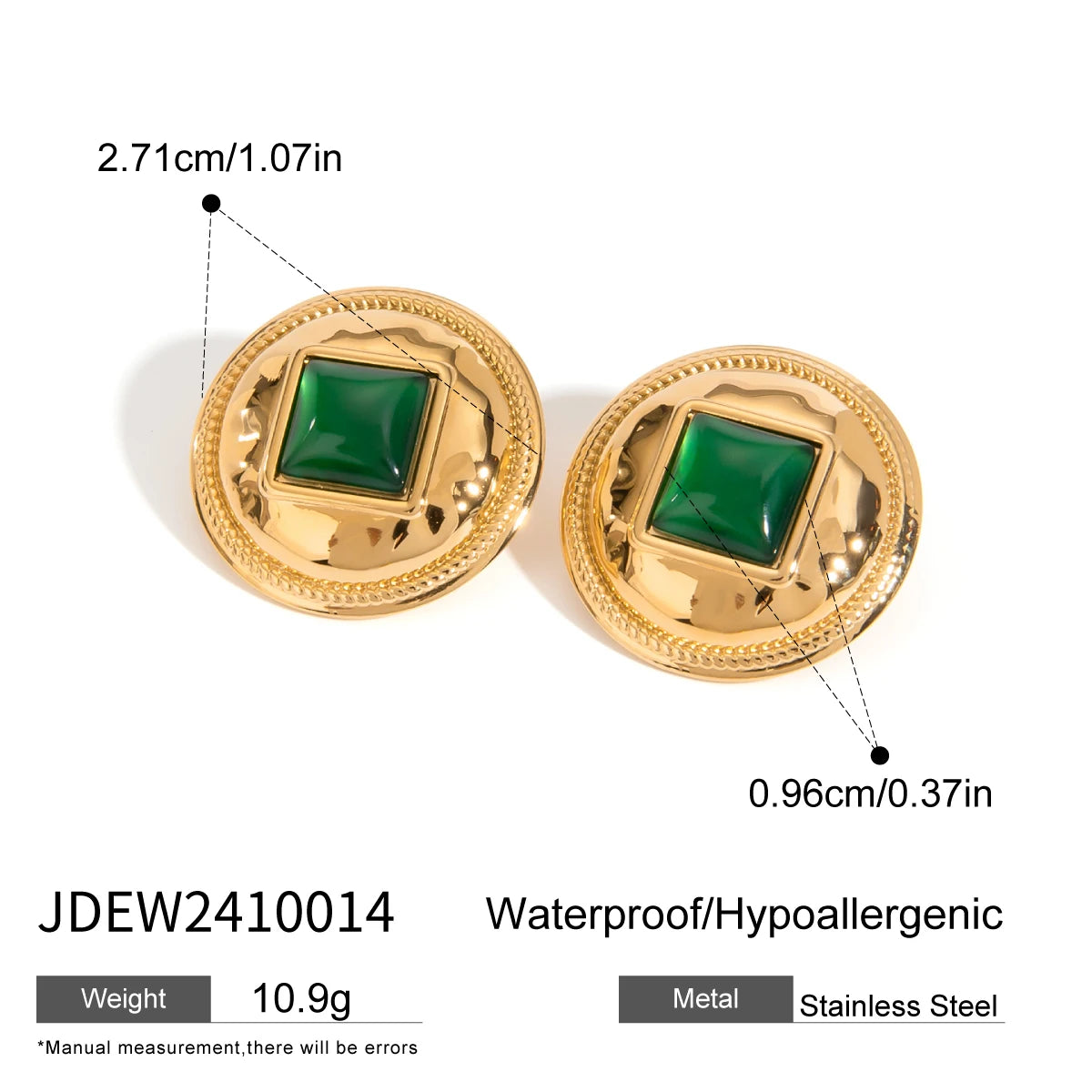 Creative 18K Gold Plated Stainless Steel Hammer Grain Earrings Inlay Green Resin Women Waterproof Attractive Jewelry