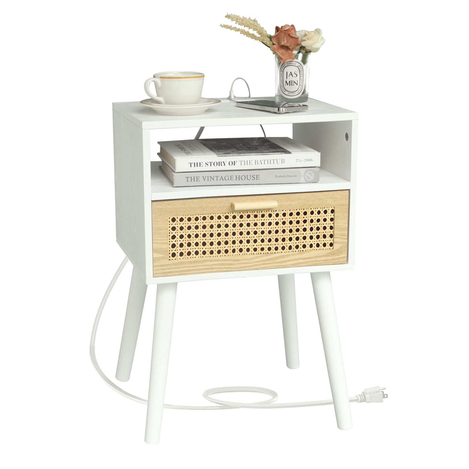 - Stilfuld og praktisk opbevaring: Sengebordet har et to-niveau opbevaringsdesign, en unik ekstra øverste hylde og en rummelig bordplade med en naturlig rattan-skuffe, der passer til dit hyggelige hjem og giver mere plads til at lægge bøger, snacks, drikkevarer