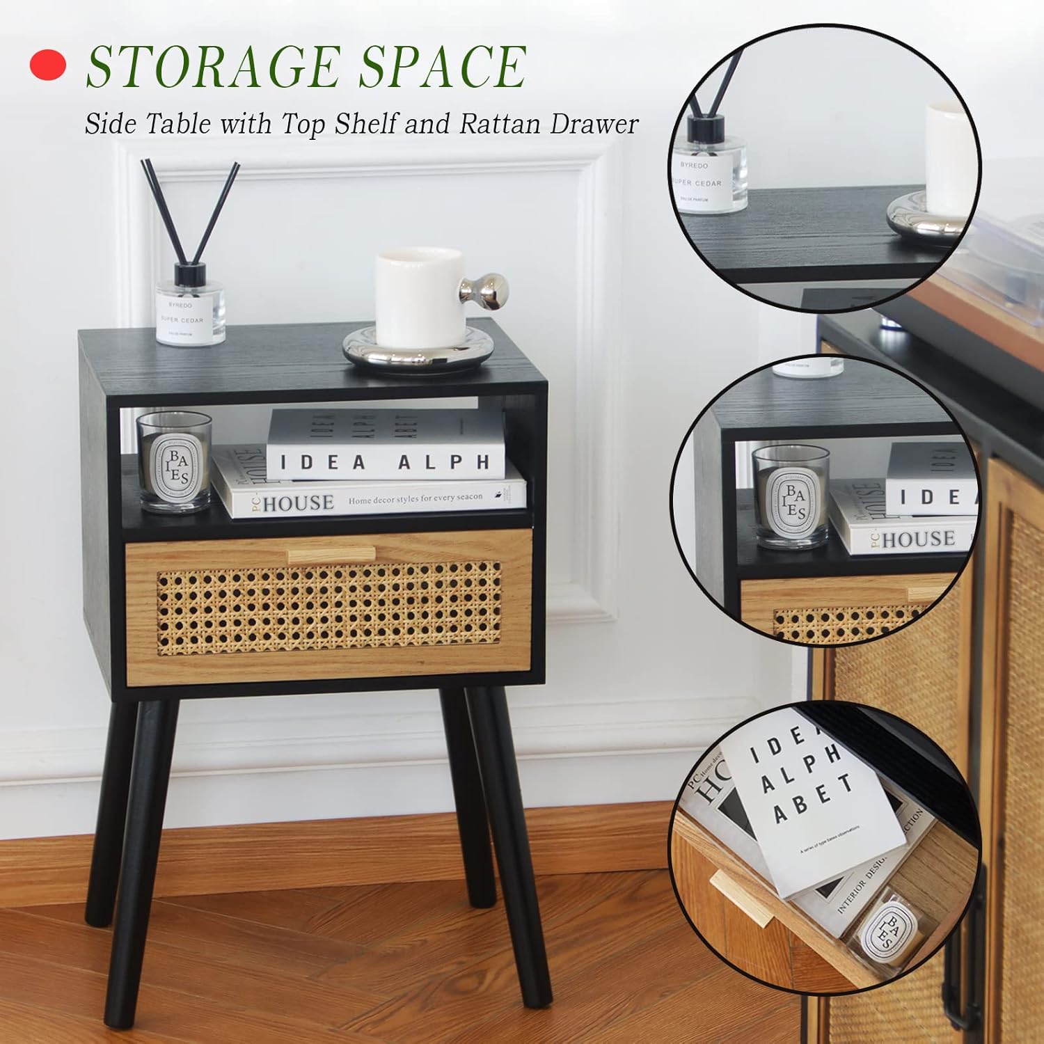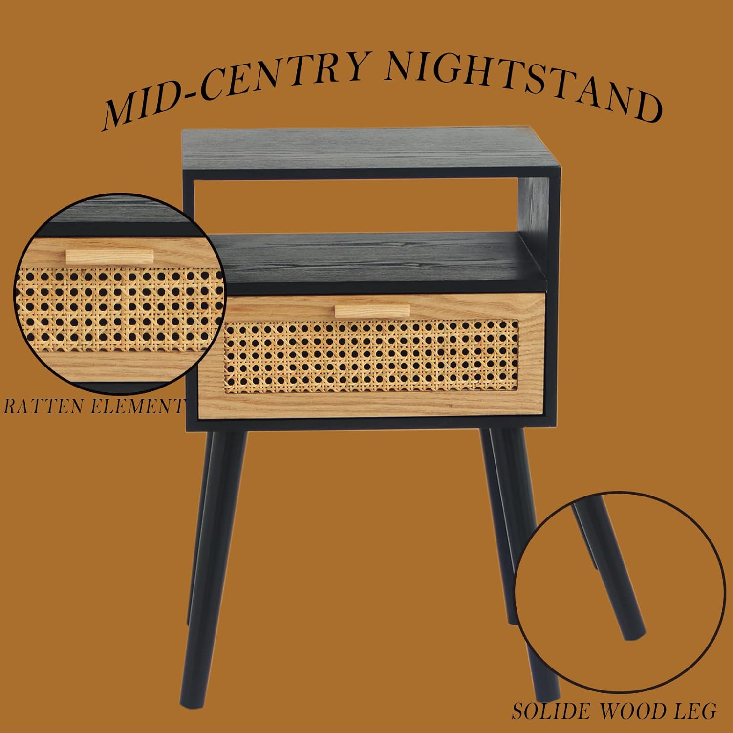 MaxSmeo Endebord med opbevaring Mid Century natbord med rattan skuffe og hylde, lille træ sidebord til kaffe til små rum, stue og soveværelse, nem montering (sort)