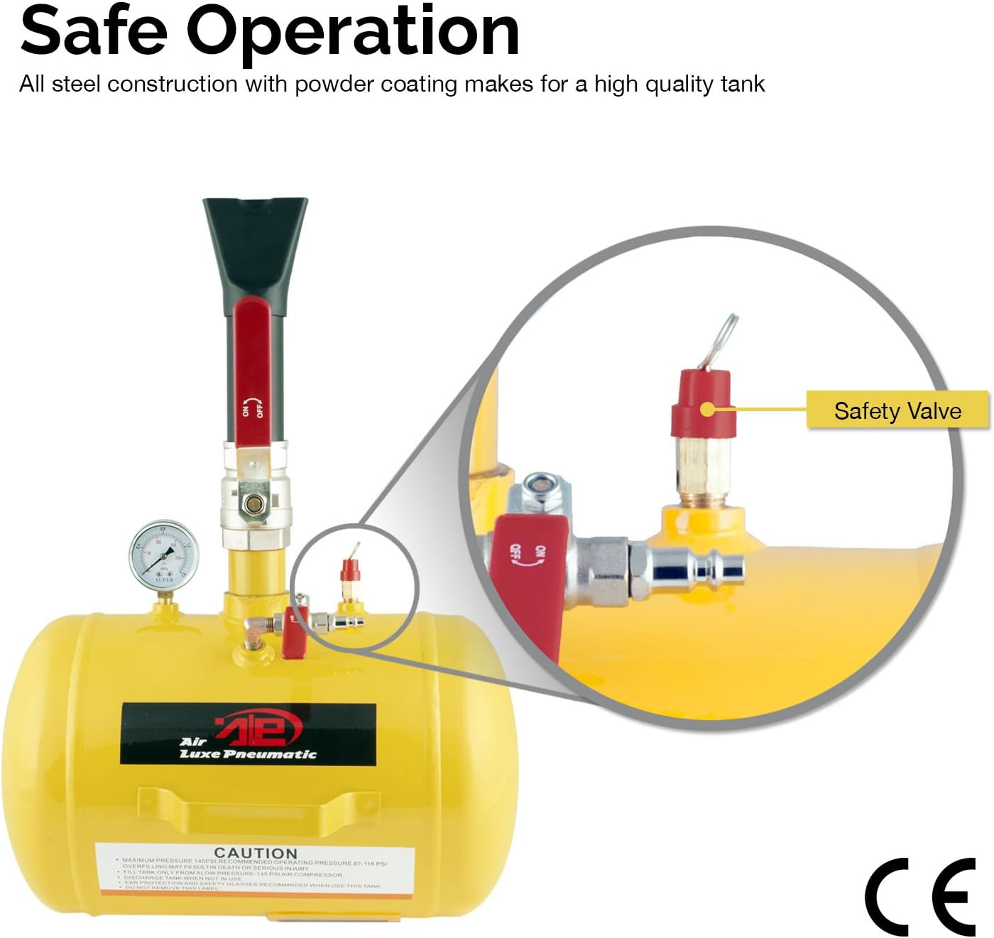 - 5 GALLON LUFTTANK: Oppuster hurtigt dæksiden for at sætte perlen på fælgkanten for alle dæk op til 24,5”, inklusive almindelige køretøjer, lastbiler, traktorer, RV'er, ATV'er og mere.
