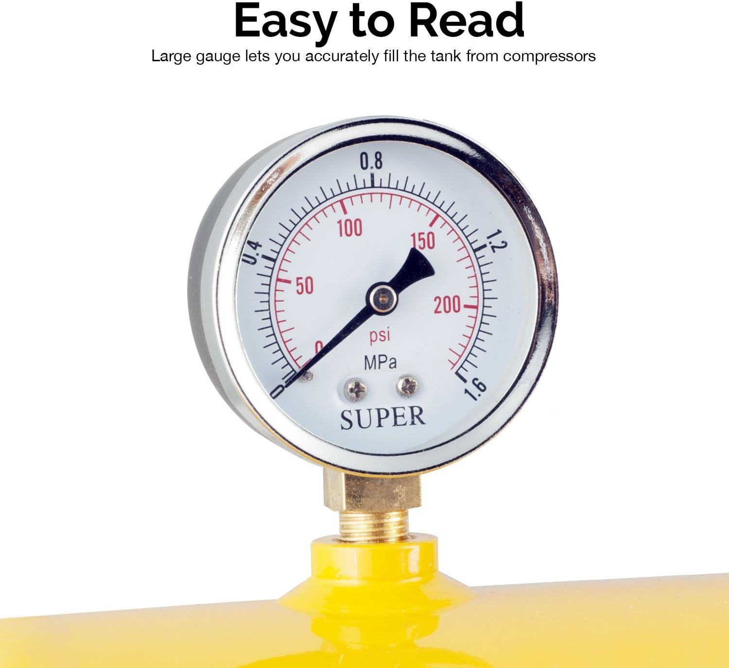 - NEM AT LÆSE MÅLER: Cheetah lufttank fylder nøjagtigt tanken fra standard værkstedskompressor ved anbefalet driftstryk på 87-116 PSI med den medfølgende nemme at læse måler.