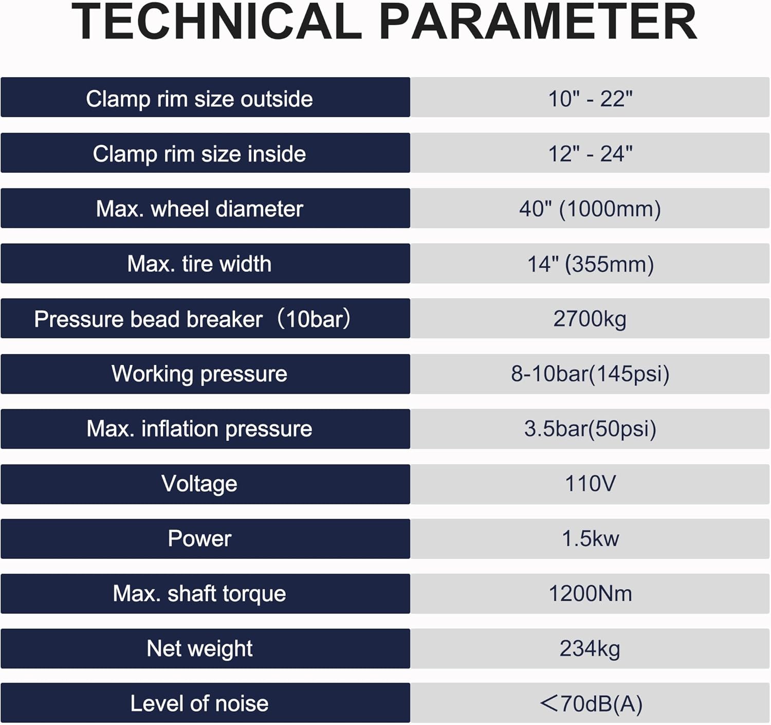 - Kompatibilitet Dækafmonteringsmaskine - Håndterer et bredt udvalg af fælgstørrelser. Klem fælgstørrelse udvendig: 10'' - 22''. Klem fælgstørrelse indvendig: 12'' - 24'' og dækbredder op til 14'', hvilket passer til forskellige køretøjstyper. Store hjul med en maksimal diameter på 40'', hvilket sikrer holdbarhed til tung brug.