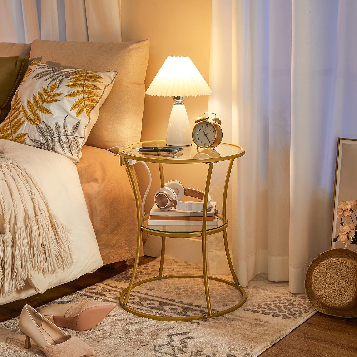 HOOBRO Rundt Kaffebord med Opladningsstation, 2-lags Lille Accent Sidebord med Glasplade, Rundt Natbord til Lille Rum i Stue, Soveværelse, Guld GD83UBZ01