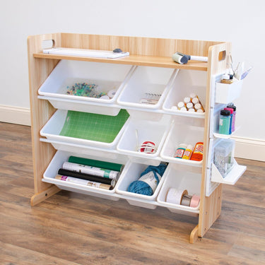 Humble Crew, naturligt træ/hvid legetøjsarrangør med hylde og 9 opbevaringsspande