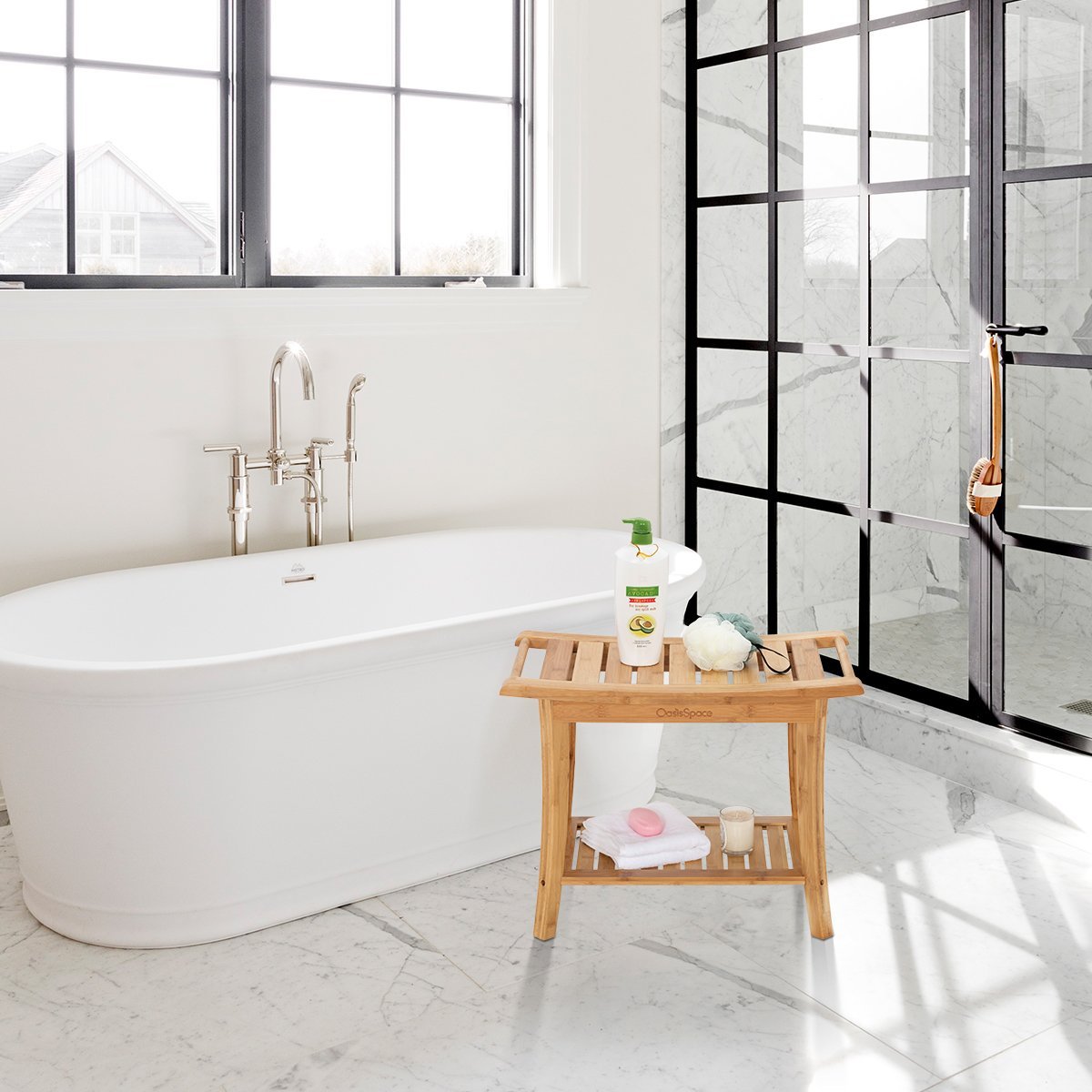 OasisSpace bambus brusebænk, 24" vandtæt brusestol med opbevaringshylde, træ spa bad organizer sæde skammel, perfekt til indendørs eller udendørs brug