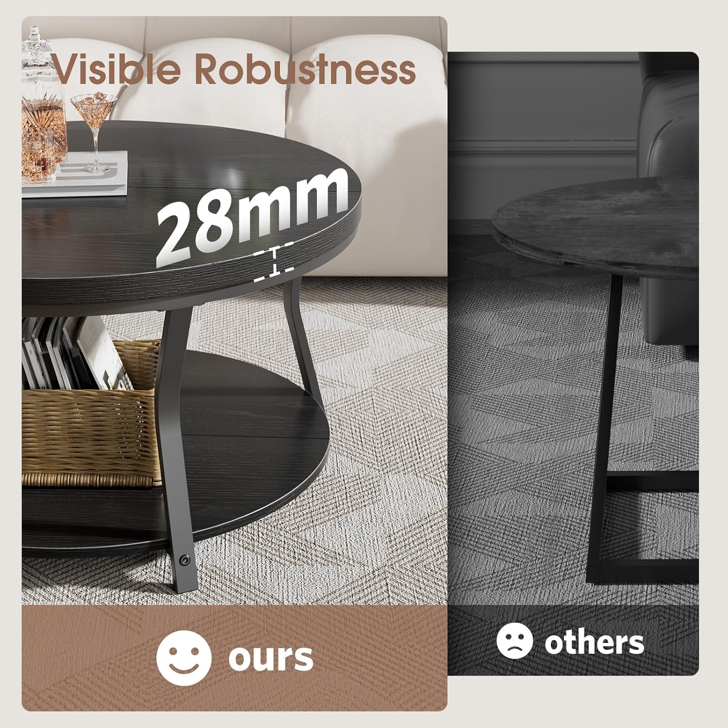 - 【Synlig robusthed】1,1" tyknet bordplade sikrer soliditet; Udvidet metalramme sikrer stabilitet. Integreret forstærkning af det runde sofabord i træ gør, at det kan bære op til 300 lbs.