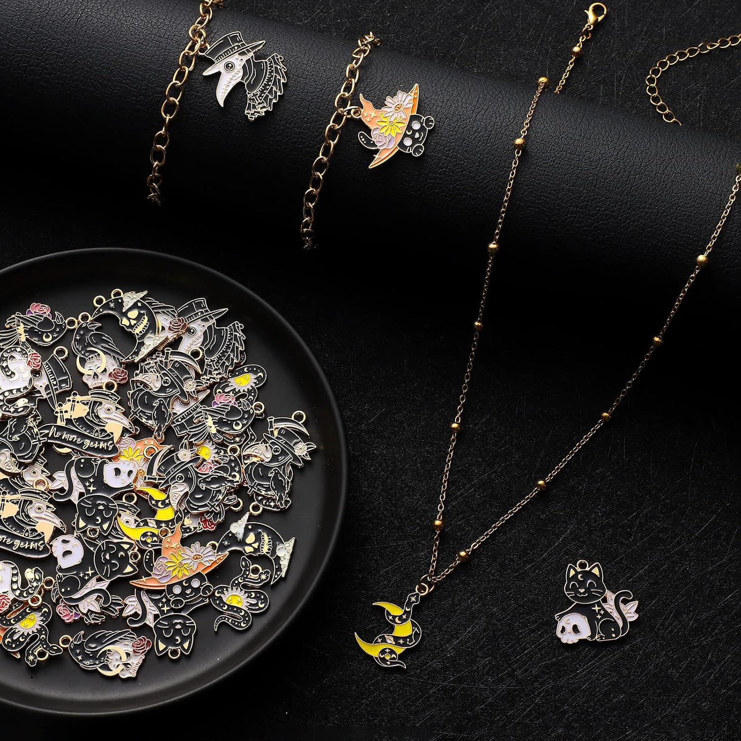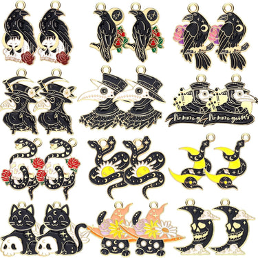 Sasylvia 48 stk Halloween charms til smykkefremstilling sorte gotiske charms inkluderer 12 stilarter krage kranium slange kat måne til Halloween fest dekoration gaver DIY kunst håndværk