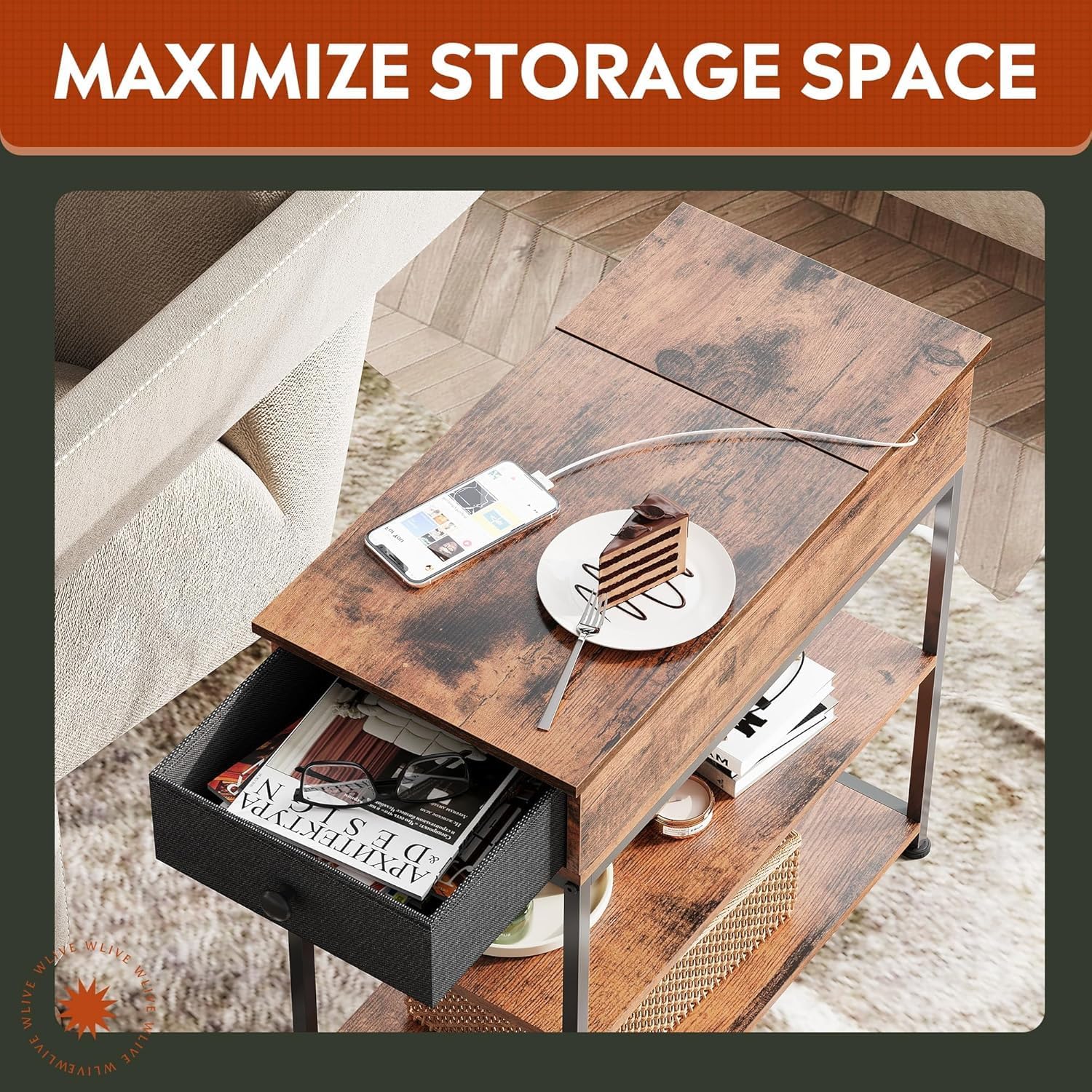 WLIVE smalt sidebord med opladningsstation, endebord til stuen, sofabord med stofskuffe til soveværelse, 11.8‘’B 23.6‘’L 24‘’H, rustik brun