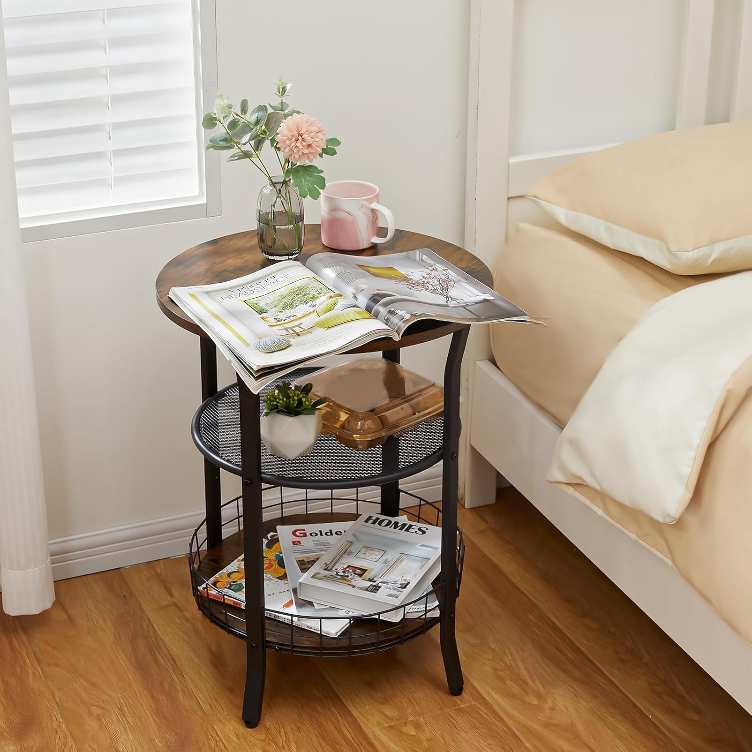 X-cosrack rundt sidebord, industrielt retro sofabord med opbevaring, kaffe- og snackbord til stue, soveværelse, køkken, kontor, stabilt træ- og metalstel, rustikt brunt