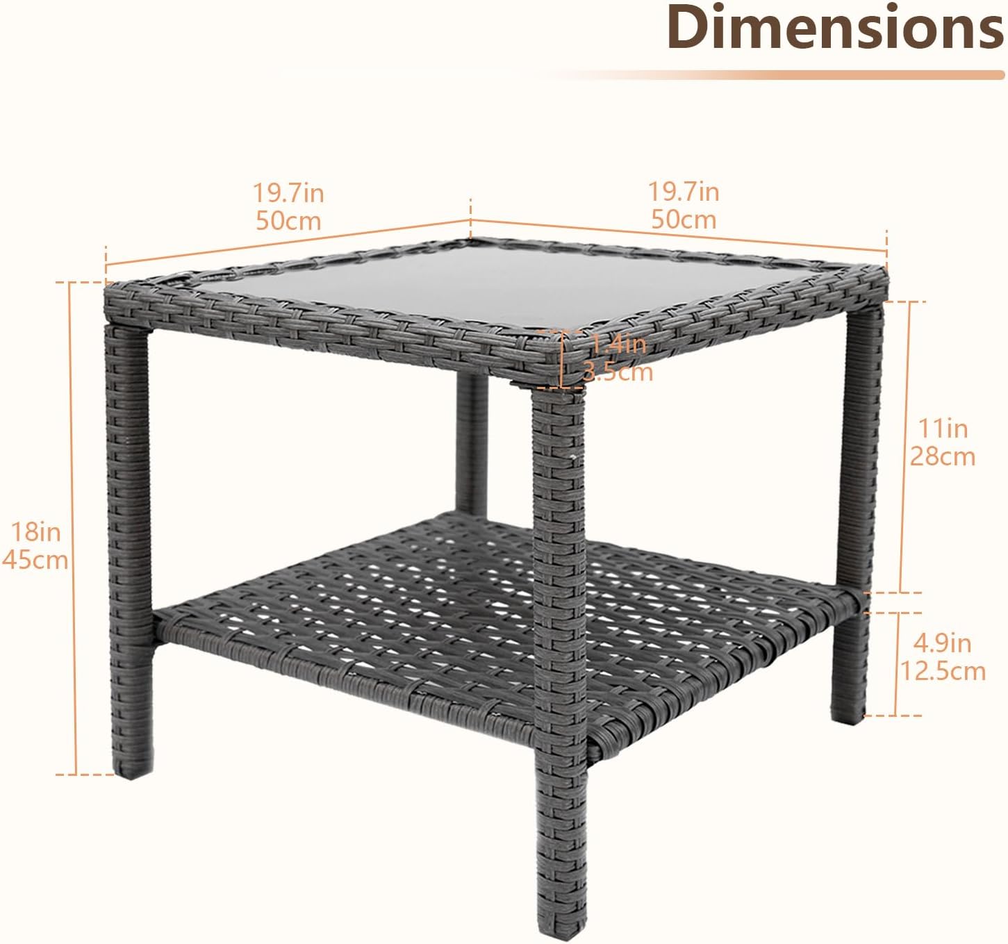 C-Hopetree Small Outdoor Coffee Side End Table for Outside Patio Storage, Gray All Weather Wicker with Glass Top, Square
