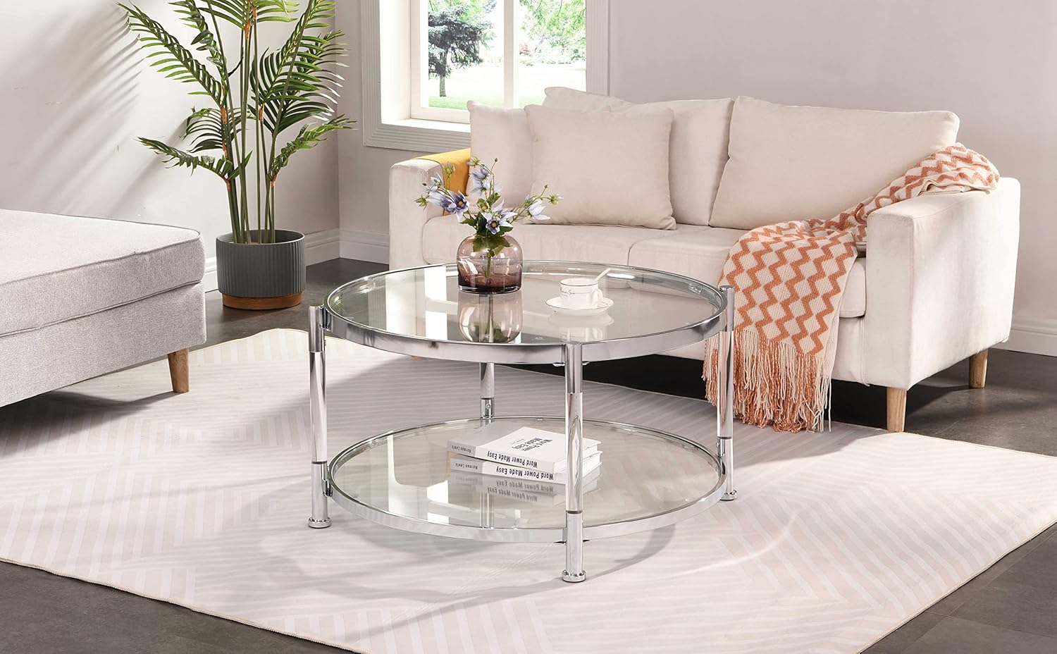 - 【Sturdy and Durable Construction】With 6mm tempered glass and a robust chrome metal frame, these round coffee tables are durable and can handle daily usage. 2-tier design. Each tier can hold up to 55 lbs