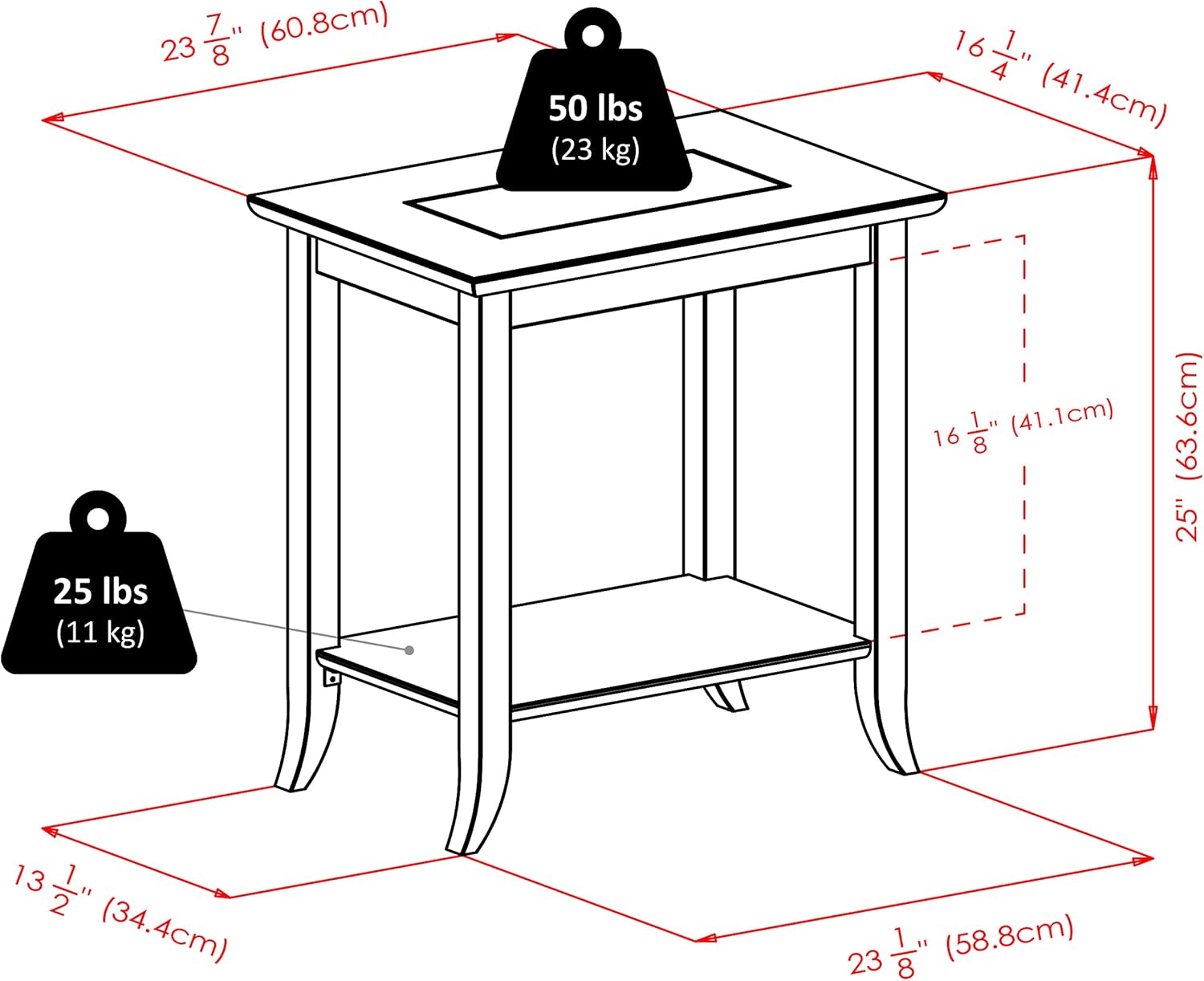 - Dimensions: 25.04"H x 23.94"L x 16.3"D. Tempered glass insert in table top.