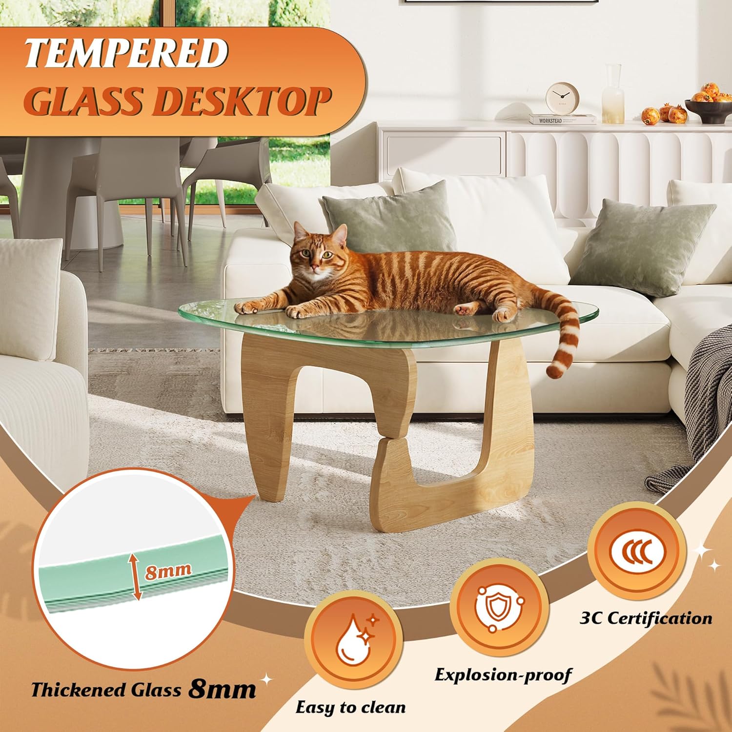 - 【Premium Tempered Glass】 Crafted with 8mm thickened tempered glass, this small modern coffee table delivers heat-resistant, shatterproof, and scratch-resistant durability—with effortless cleaning. Its crystal clarity enhances natural light, creating a bright and airy spatial ambiance
