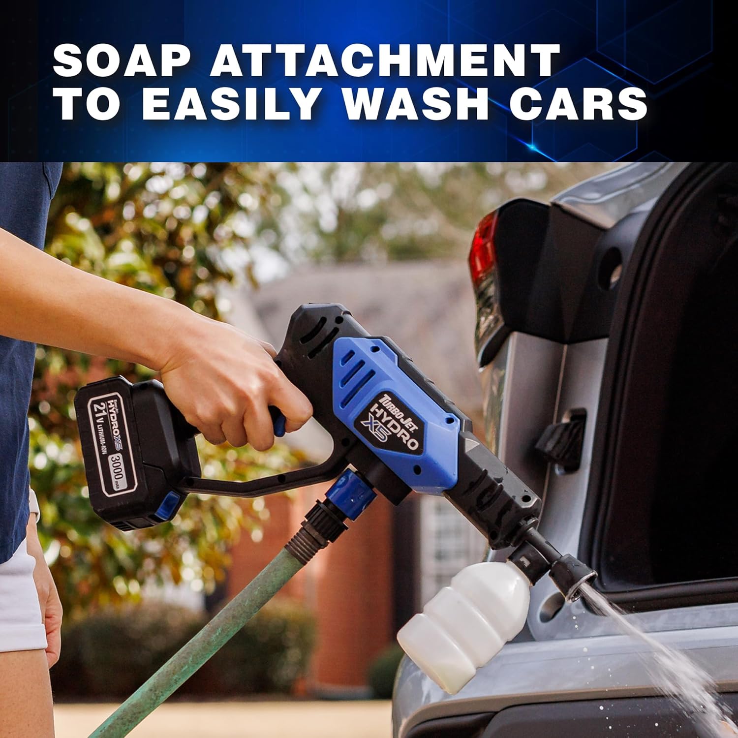 - All-in-One Cleaning Kit, Ready to Go: The Turbo Jet HydroX5 Pro includes everything you need, including a quick connect adapter, 16FT hose, 3 extra spray tips, water filter, shutoff adapter, soap bottle and foam cannon, charger & a hard storage case