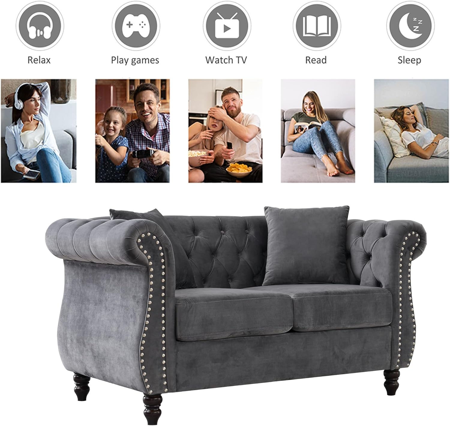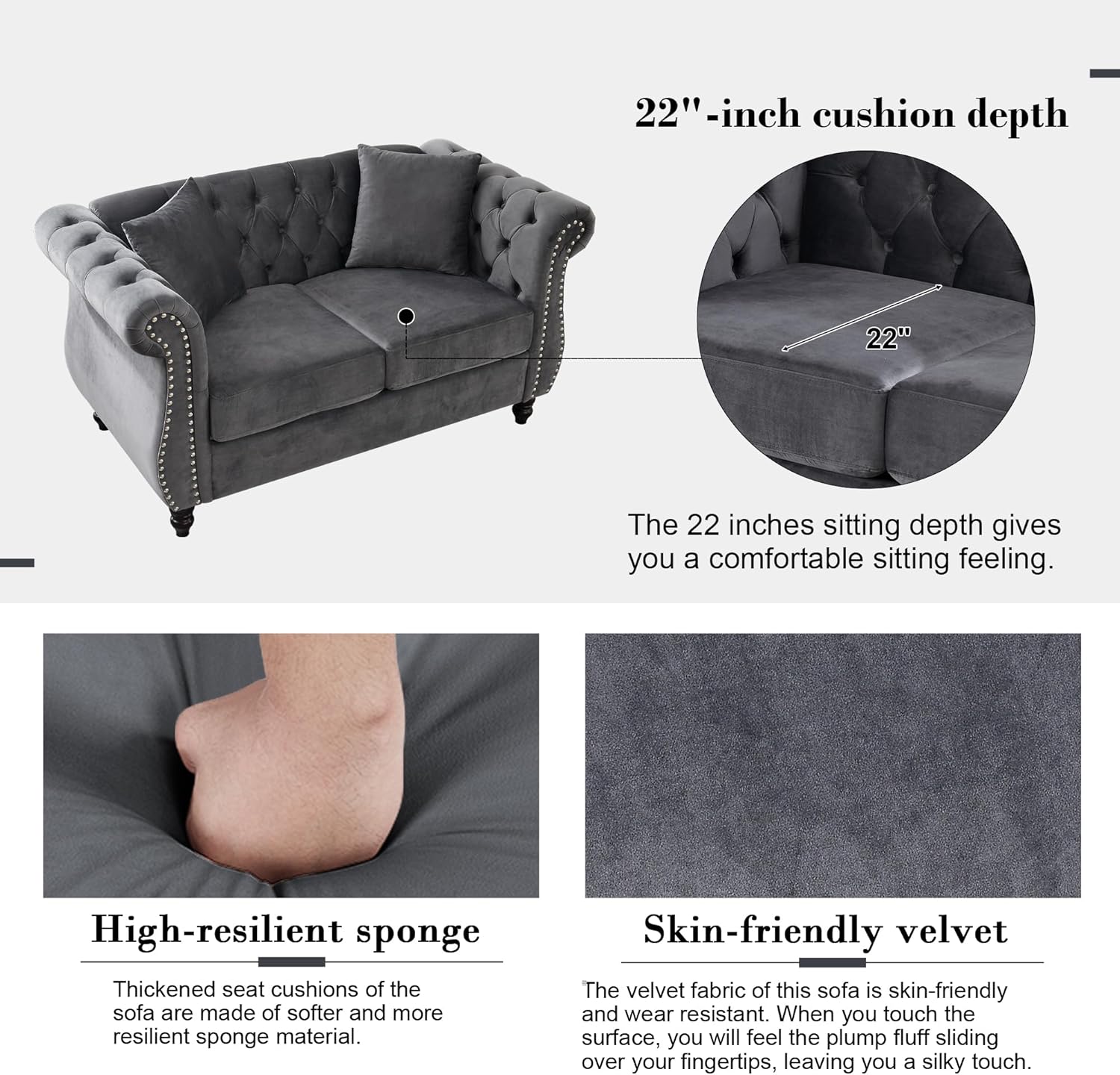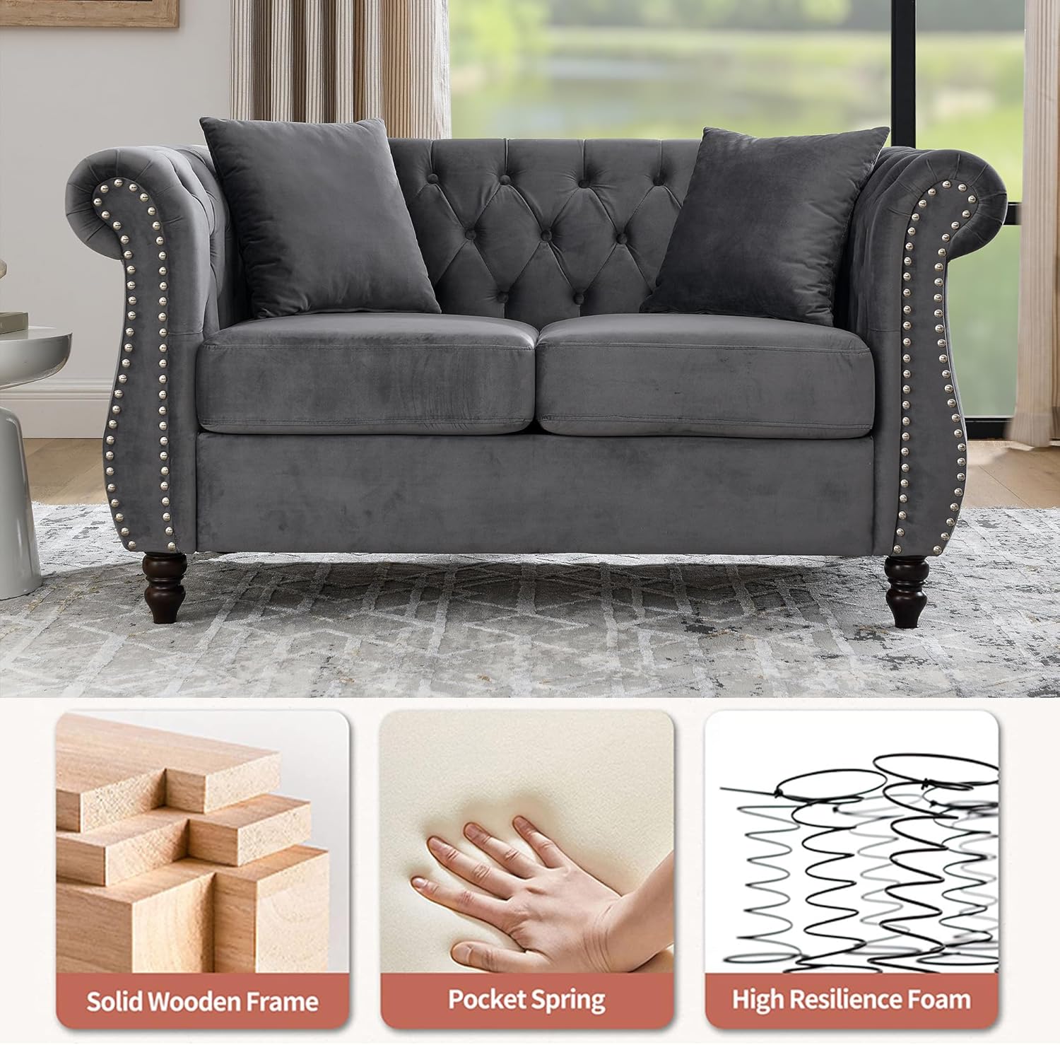 59" Chesterfield Loveseat Velvet Sofa for Living Room,2-Seater Sofa Tufted Couch with Two Pillows,Rolled Arms and Nailhead for Living Room, Bedroom, Office Grey