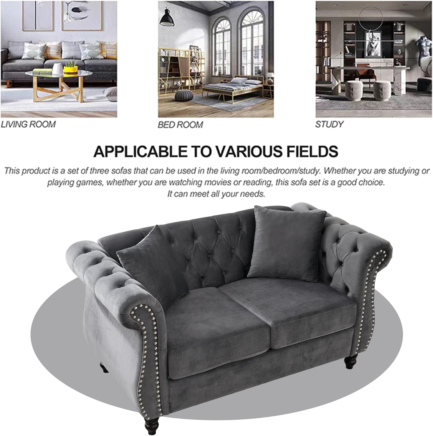 - 【The 59" Loveseat classic Chesterfield sofa】Loveseat Velvet sofa Set is not only comfortable to sit, beautiful appearance, looking simple and generous, and fashionable temperament--Featuring the classic Chesterfield sofa design, it is classic and sophisticated. Perfect with any decorative theme, this sofa is the perfect choice for your living room, bedroom or office.(The cushions are compressed and take 48-72 hours to fill.)