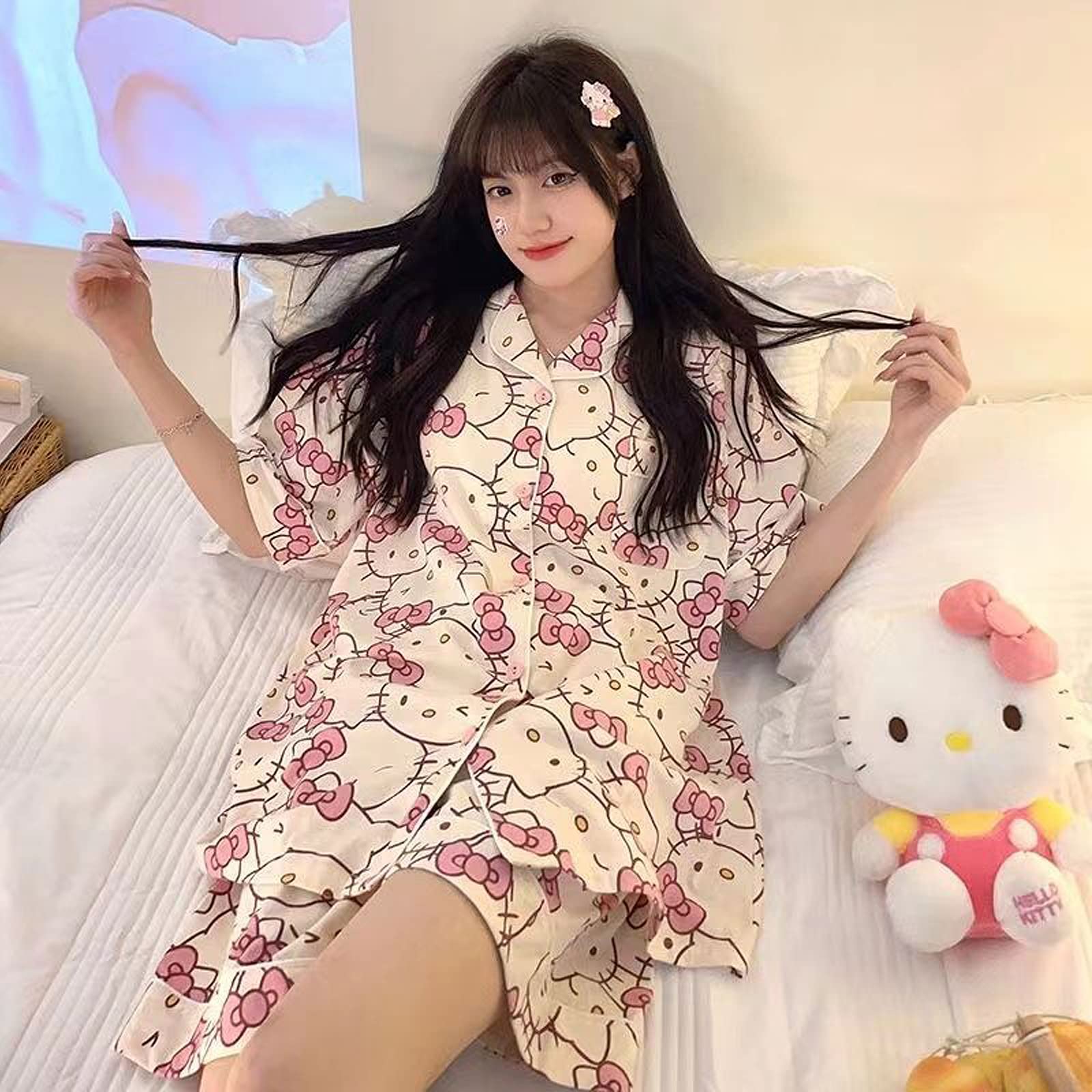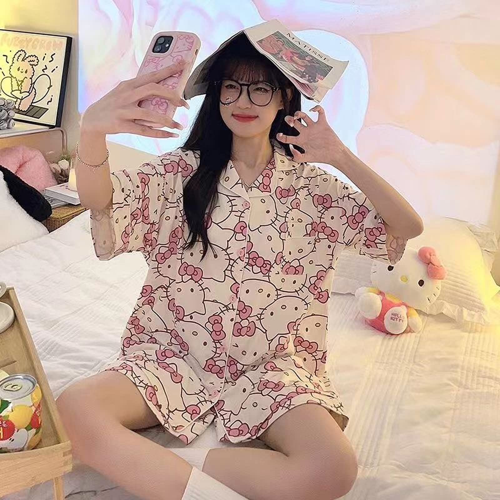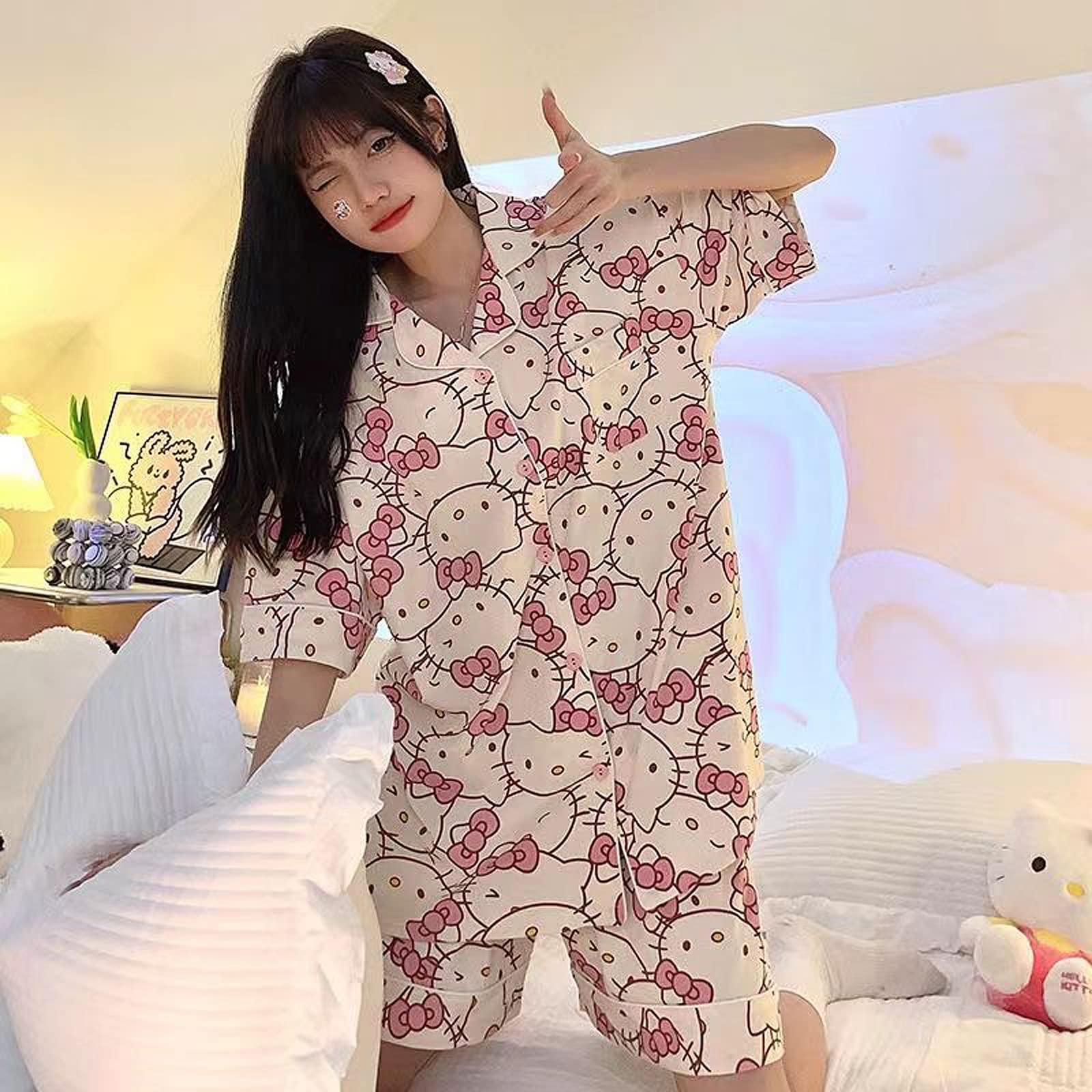 Ocroyea Kawaii Pyjama für Damen Kurzarm-Cardigan Pjs Zweiteiliges Set Süßer Cartoon-Mädchen-Pyjama Freizeit Kurzarm-Schlafanzug Hauskleidung