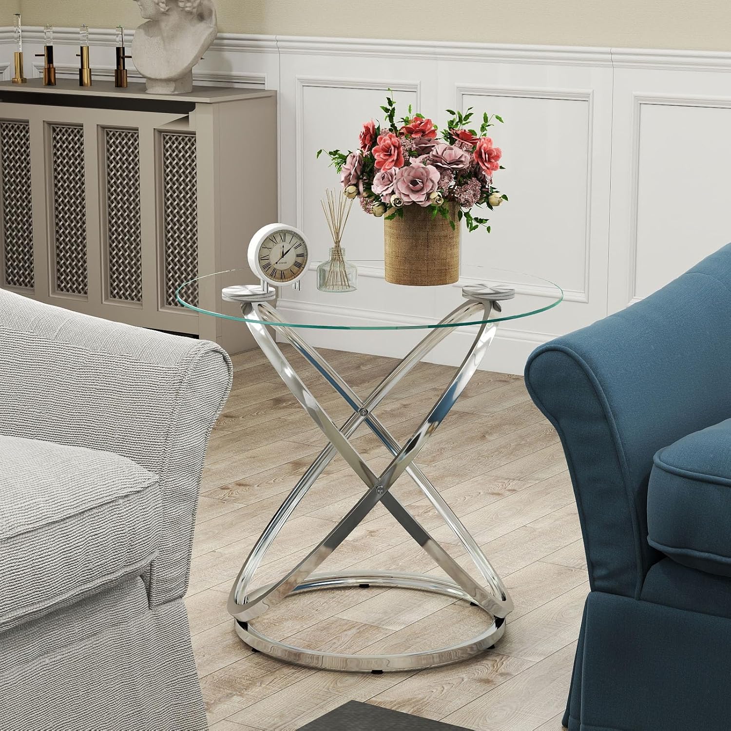 OIOG Glass Round End Table, Modern Contemporary Side Table for Small Space with Tempered Glass Tabletop for Living Room, Chrome Finish
