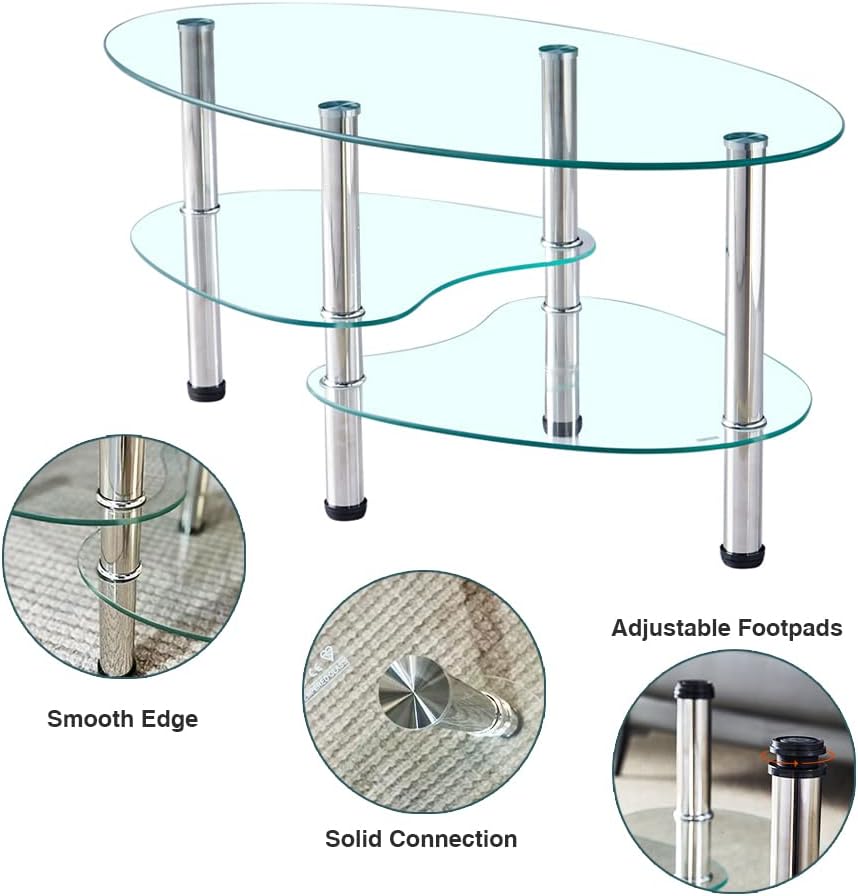 - 1.High-Quality Materials: Thickened and sturdy coffee table, waterproof,durable wear-resistant. Glass coffee tables exquisite welding process, the oval-shaped frame is more safety .