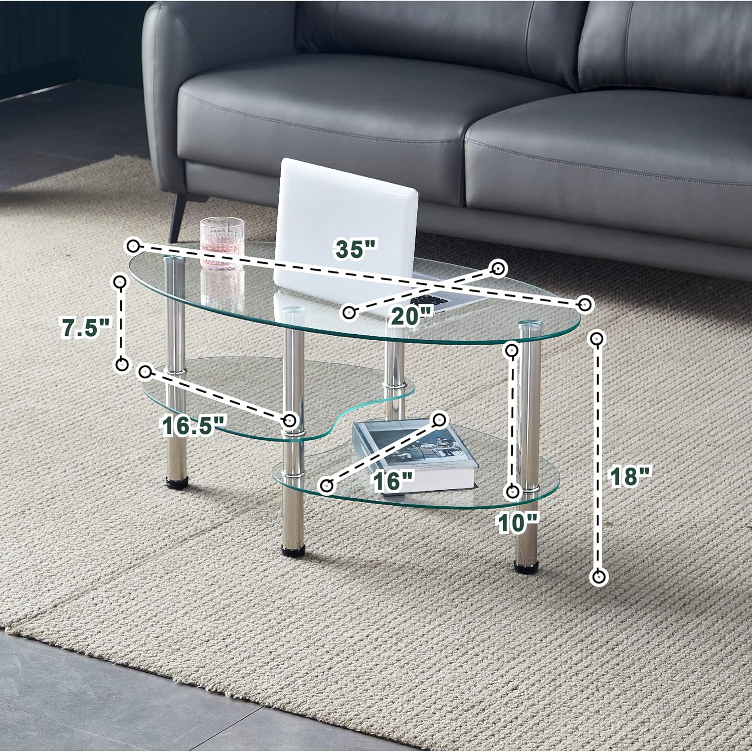 - 2.Product Size:The size of the clear glass coffee table with storage is 35*20*18 inches. The oval shape coffee table has two layers to provide a larger space,you can put cups, photos, books, toys, magazines etc.