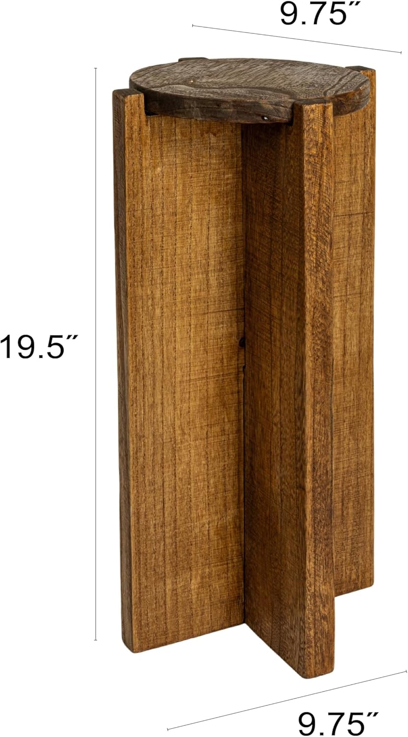 This paulownia wood table is a versatile piece that will complement any space. The table is a hand-hewn paulownia wood piece with a brown finish, creating a natural look and feel. The table arrives in three pieces that are very simply assembled in five minutes. It is made of durable and lightweight paulownia wood, a tree that regenerates quickly. The table measures 9.75 inches in diameter and 19.5 inches in height and supports up to 100 pounds of weight. This paulownia wood table is a versatile and functional piece that can be used as an accent table, side table, nightstand, or a plant stand. Complementing styles from farmhouse to minimalist, this piece adds a simple and functional touch to any home.