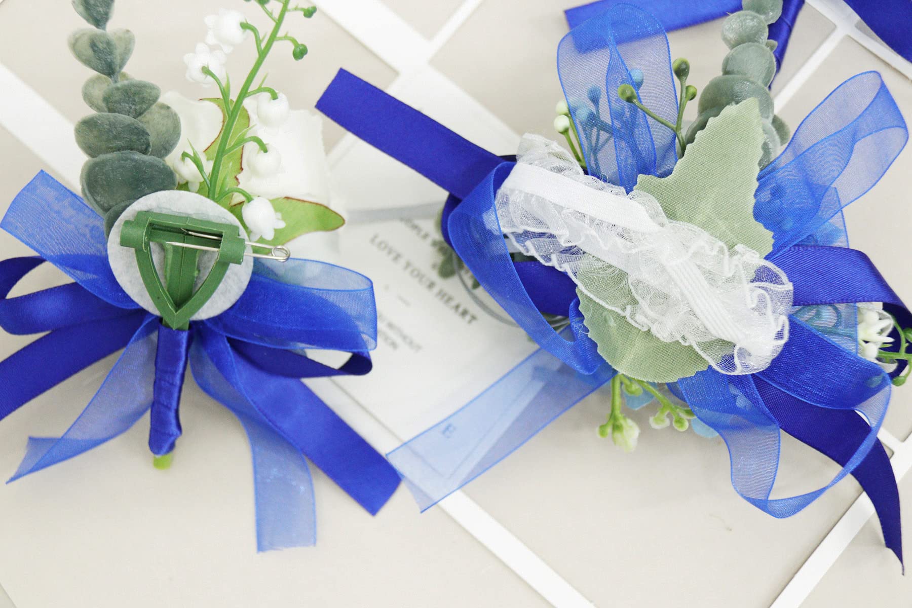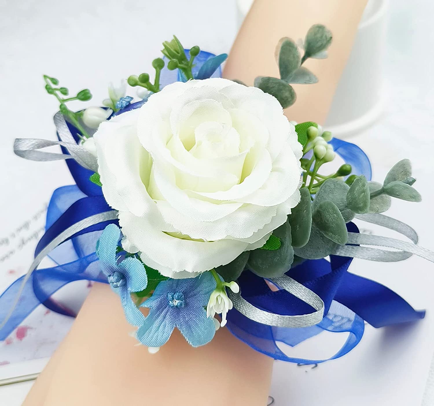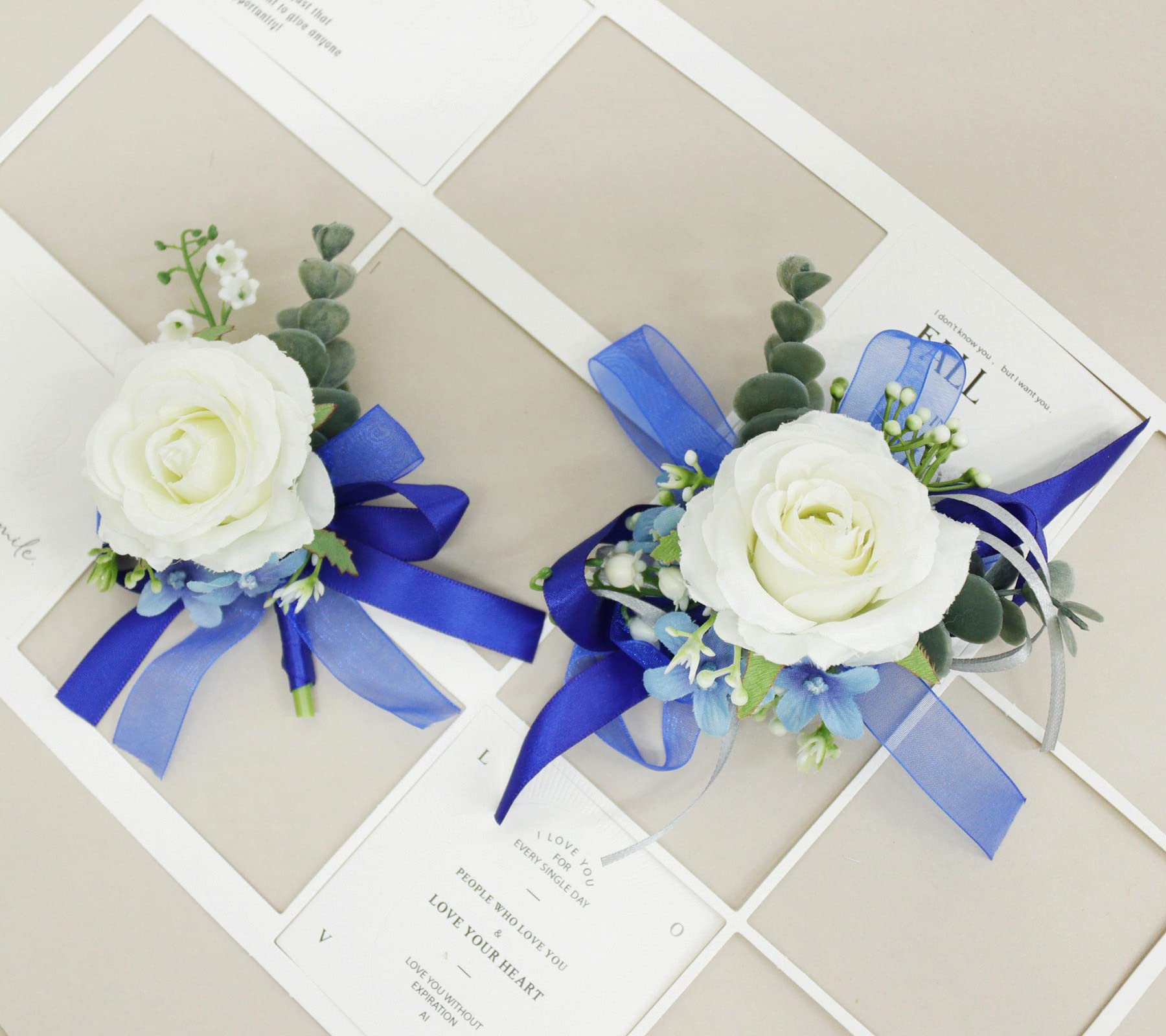MAFELOE Wrist Corsage and Boutonniere Set Artificial Rose Flowers Accessories for Groom Bride Groomsmen Bridesmaids Wedding Party Prom Suit - Blue White 2 Pieces