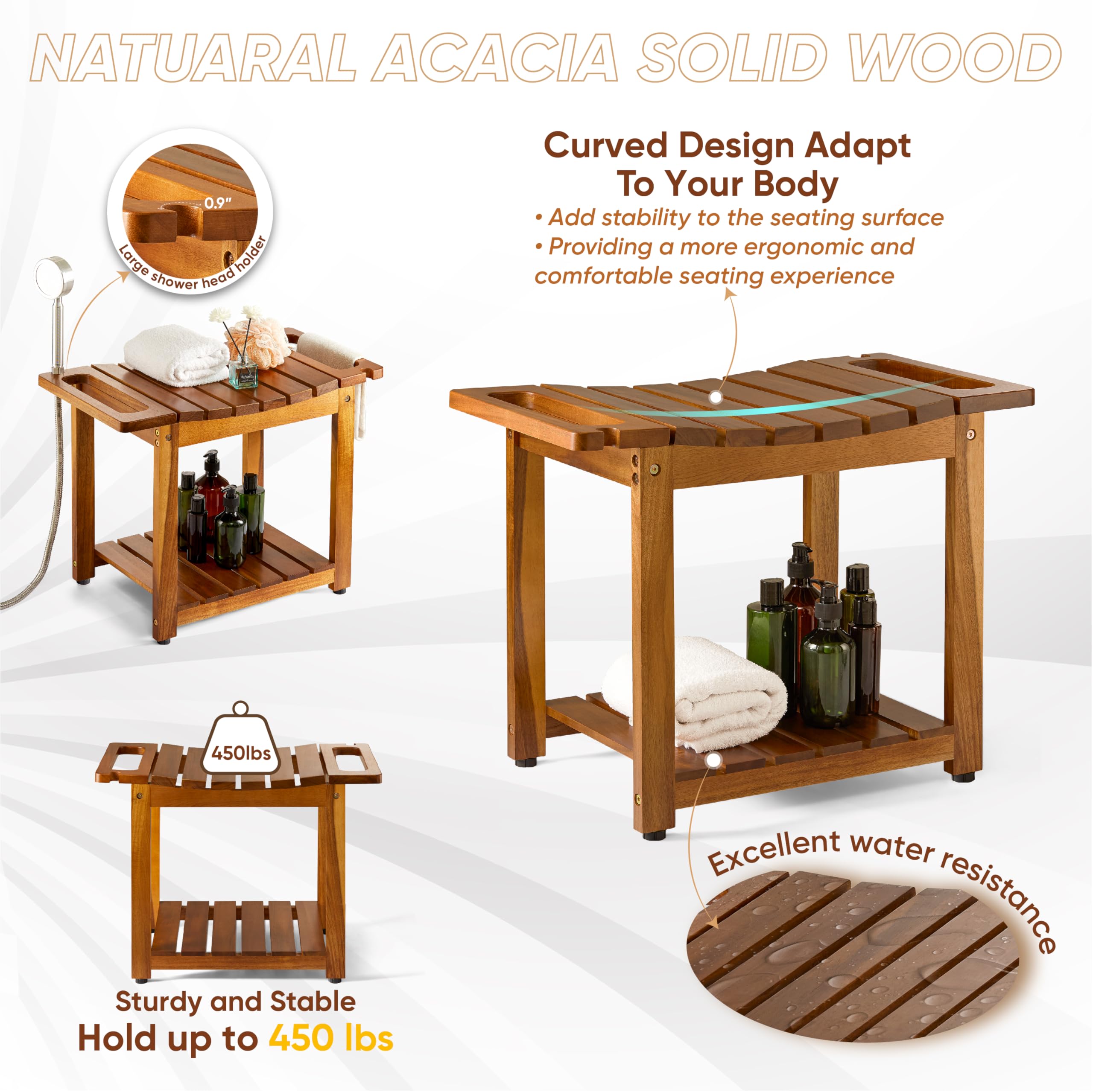 BLUEWEST Shower Bench Seat with Storage Shelf, Natural Wood Shower Benches for Inside Shower to Sit on, Waterproof Bathroom Spa Bench Stool for Legs Shaving with Built-in Handle & Shower Head Holder
