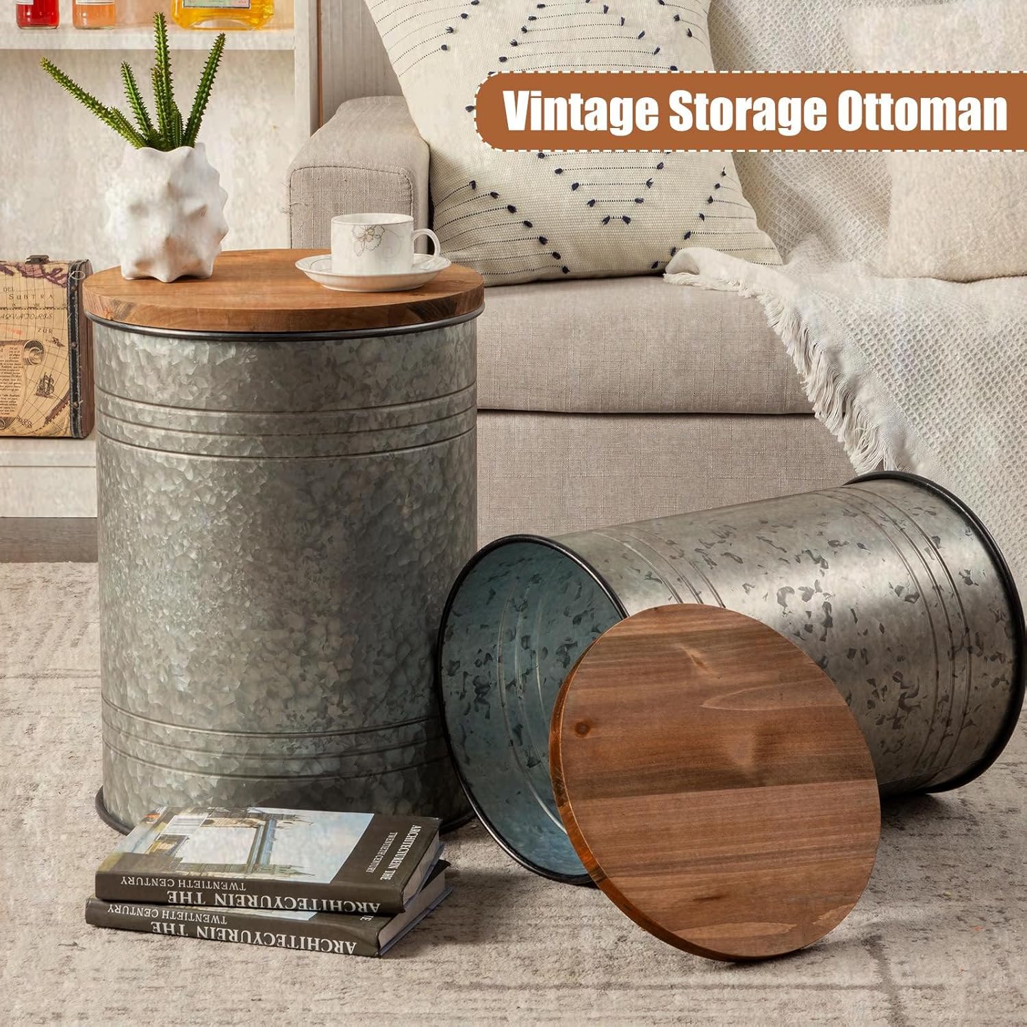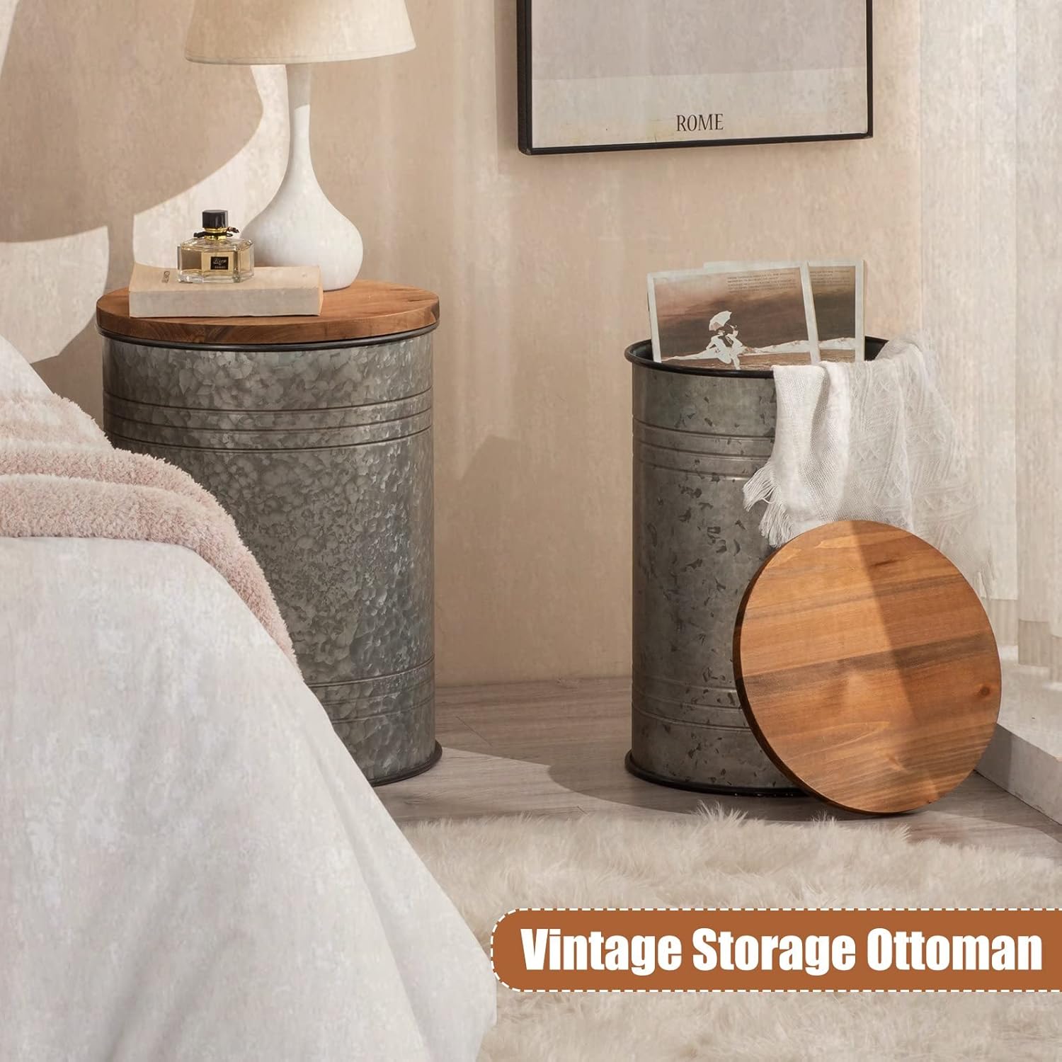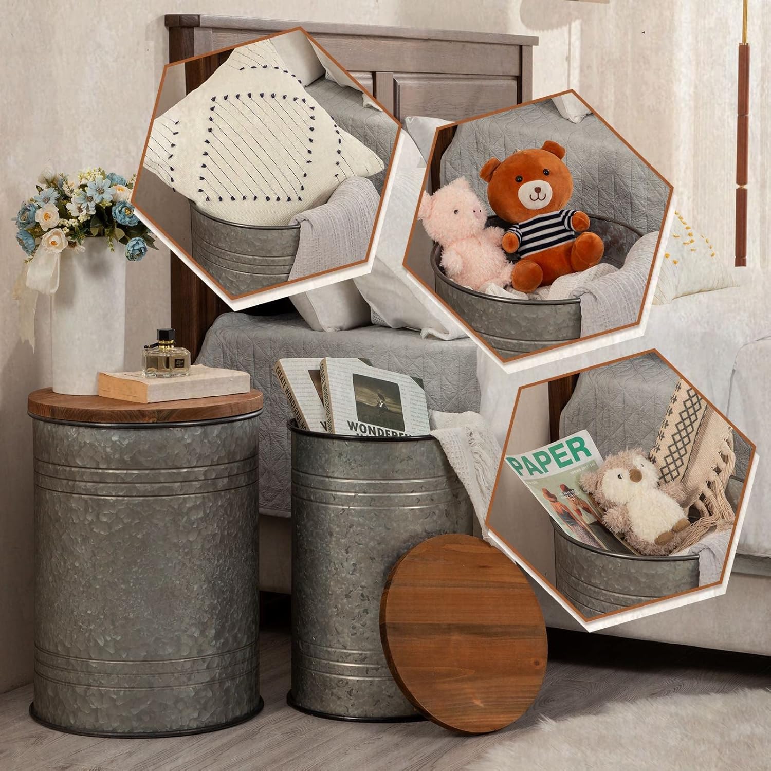 Poofzy Farmhouse End Tables Set of 2, Galvanized Metal Decor Side Table with Wood Lid, Coffee Table Storage Stool for Living Room (Grey)