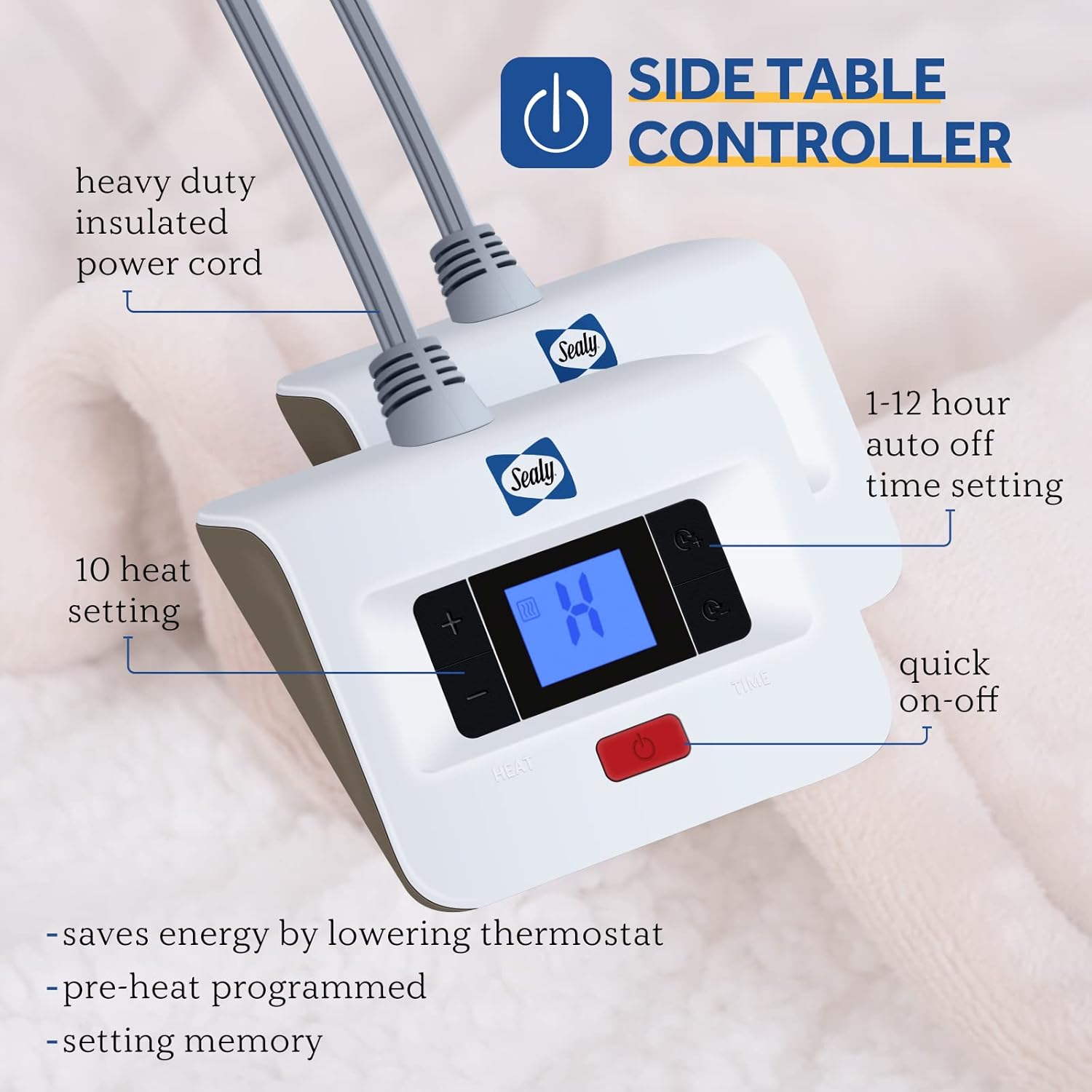 - Dual Digital Controller : Sealy electric blankets queen size includes two controllers which can be adjusted independently to personalize the heat zones and provide the comfort for multiple users. With 10 heat setting (87-126°F), built in continuous sensing technology to monitor and adjust temperature to be maintained at your setting heat level, with adjustable 1-12 hour auto shutoff time setting, ensure safer user experience and further leaves you peace of mind