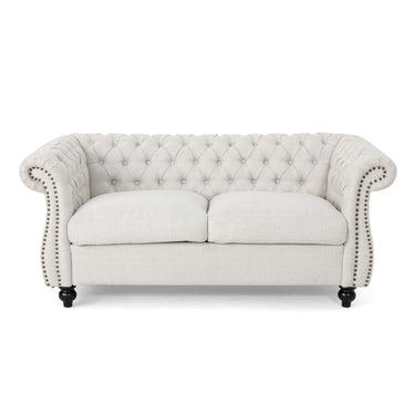 With our gorgeous loveseat, the timeless Chesterfield look can make its way into your living room with a modern touch. Taking this cherished classic design, this piece features traditional elements such as deep button tufting, scrolled arms, elegantly turned legs, and nailhead accents. Finished with a low backrest, this loveseat offers an open, streamlined design for your lounge area. Along with its impeccable style, this deeply-seated loveseat provides exceedingly comfortable cushions, instantly making this the centerpiece of your interior space.