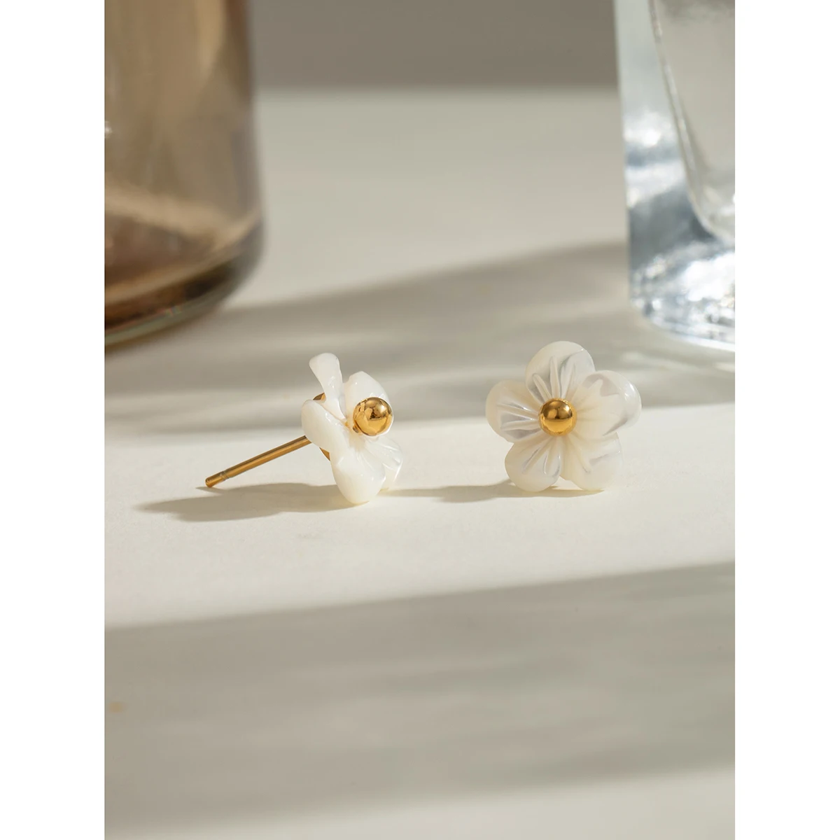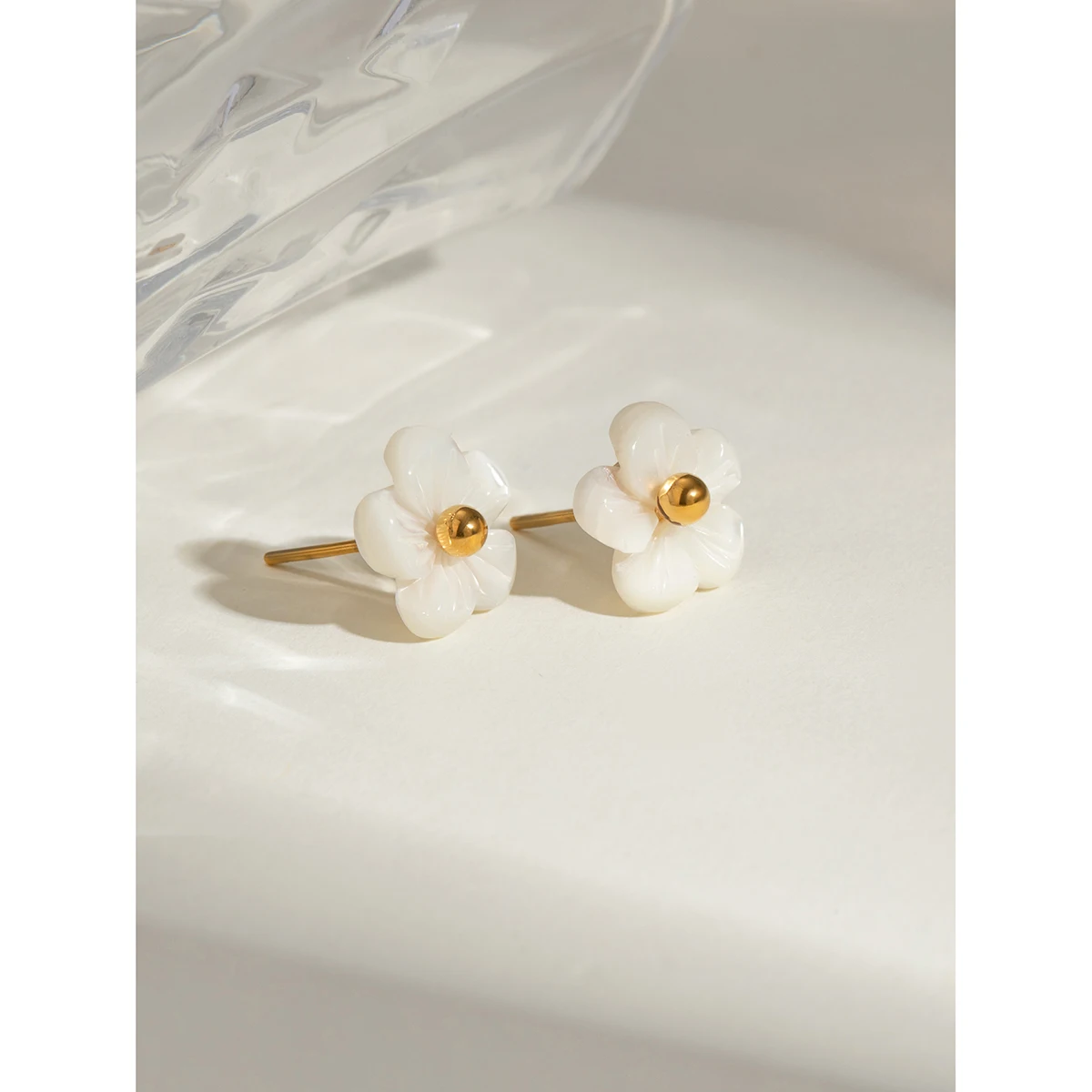 Pendientes elegantes diarios para mujer con cuentas adhesivas de flor de concha blanca de acero inoxidable resistente al óxido minimalista PVD de 18K