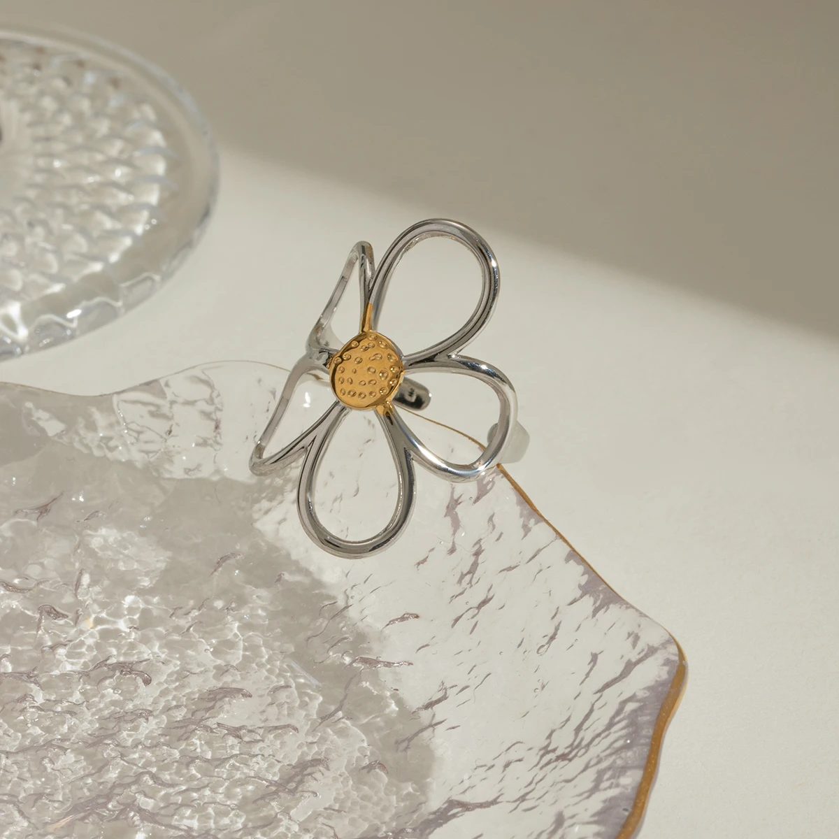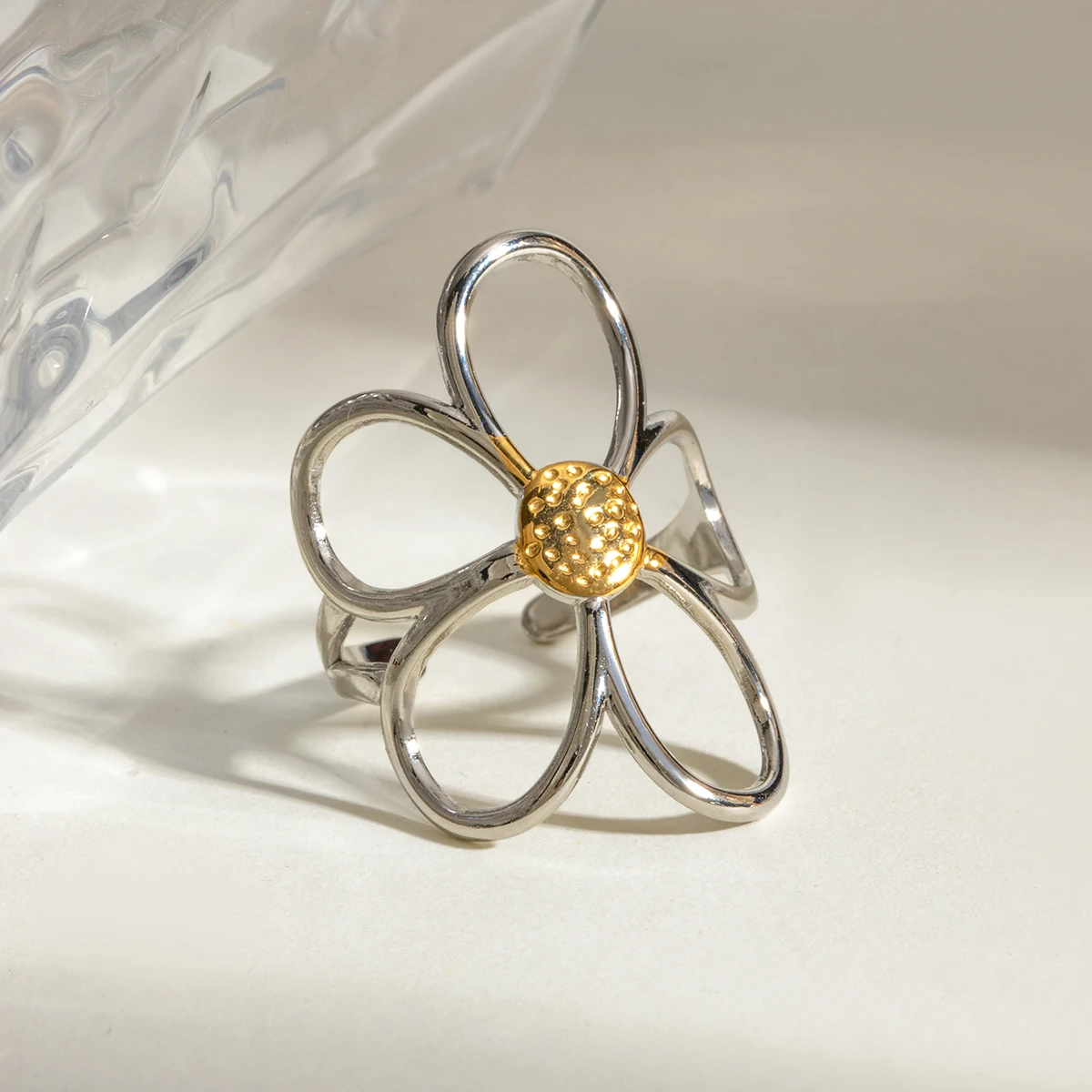 Anillo abierto hueco de flor retro creativo de acero inoxidable, lujo ligero, chapado en PVD 18K, antihipoalergénico, a prueba de óxido, joyería elegante