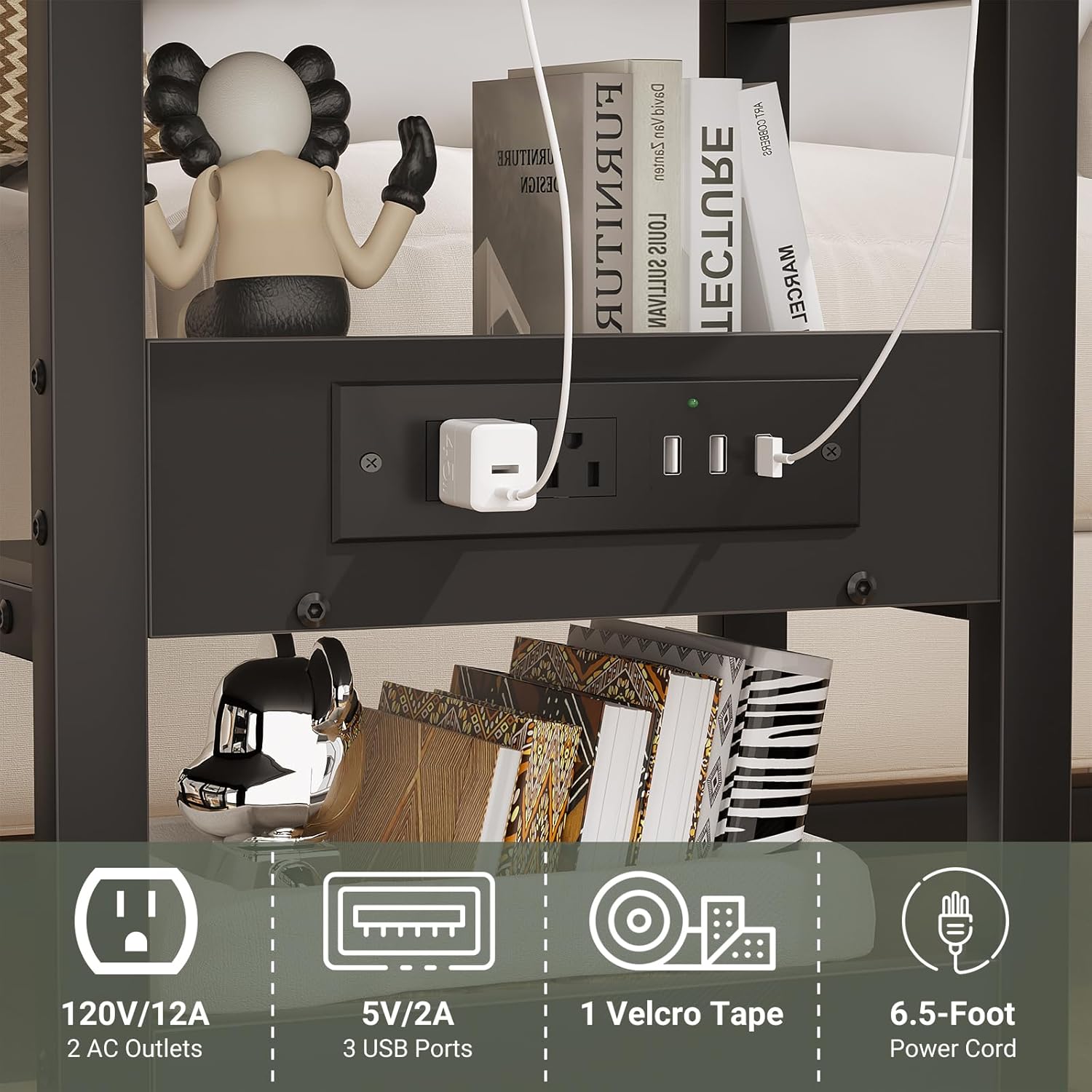 Height Adjustable End Table with Charging Station, Mobile C Shaped Laptop Side Table with Wheels, 3-Tier Sofa Couch Table with Storage Shelve for Living Room Bedroom, Black