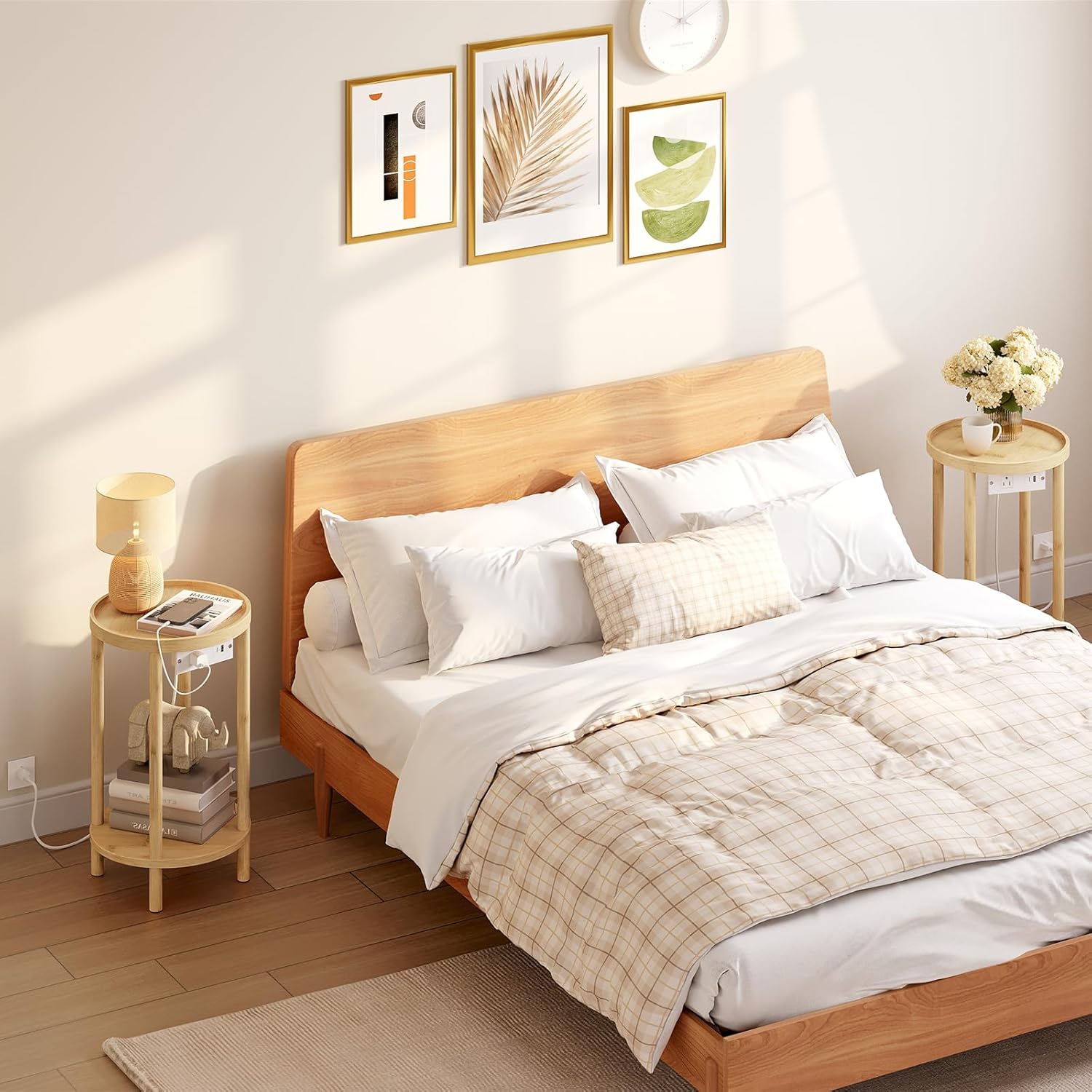 HOOBRO Small Round Side Table with Charging Station, 2-Tier Round Bamboo End Table, Compact Sofa Bedside Table for Small Space, Easy Assembly, for Living Room, Bedroom, Apartment, Natural YL156UBZ01