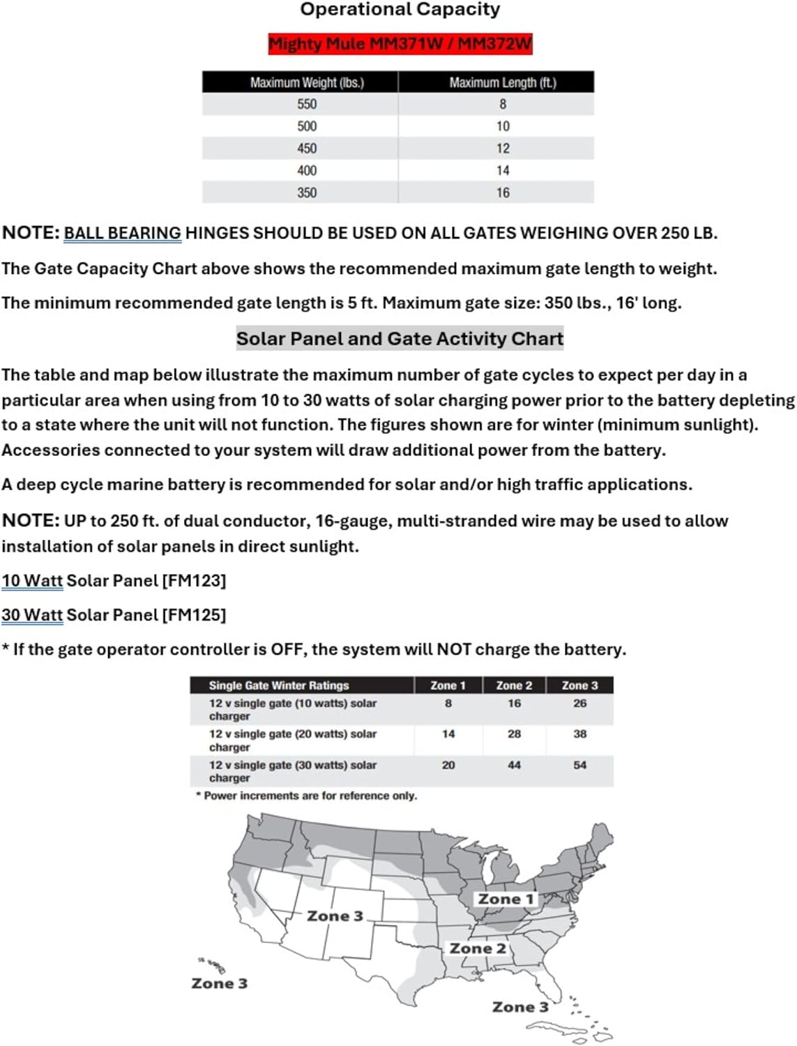 - Solar Capable: Easily make this into a solar gate opener with the Mighty Mule 10W solar panel (Model #FM123, sold separately) and use it to charge the gate battery (Model #FM150, sold separately)