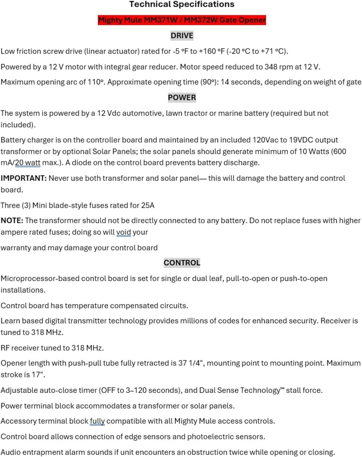 | Included Components | (1) AC Transformer for hard wire applications, (1) Control Box, (1) MM371 Gate Operator, (1) Remote with Visor Clip, Mounting Hardware |