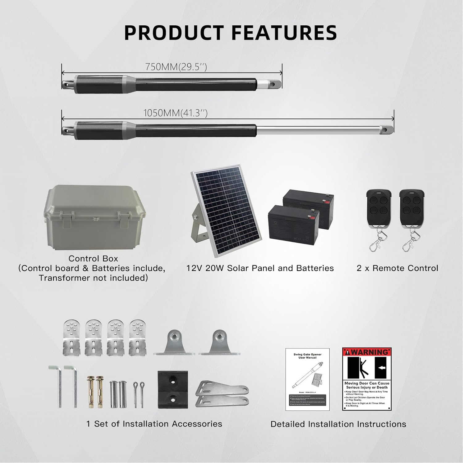 | Included Components | 12V 20W Solar Panel *1, Batteries *2, Remote Control *2, Swing Gate Openers *2 |