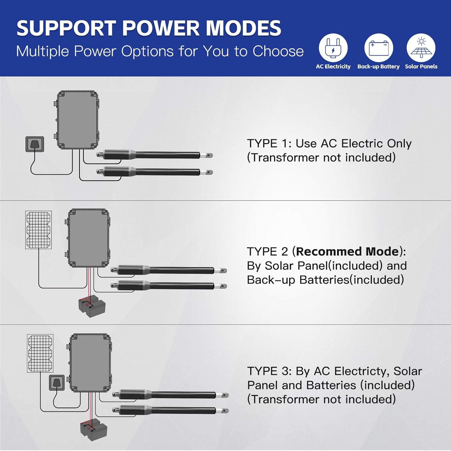- 【Please Note】The transformer is not included. To power the gate opener, simply connect a 12V AC power source to the AC power port or use 12V DC batteries(Included, Use Parallel Connection) with the battery port.